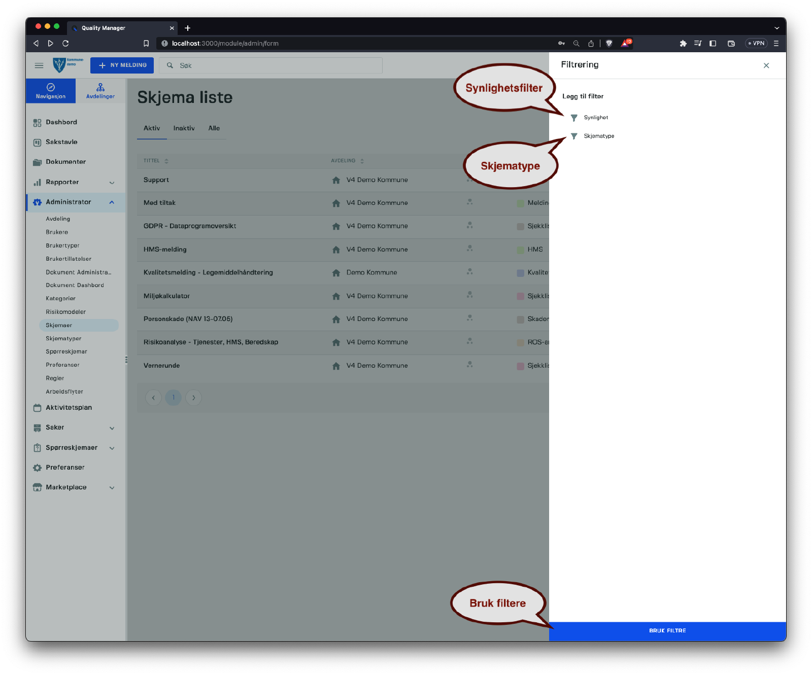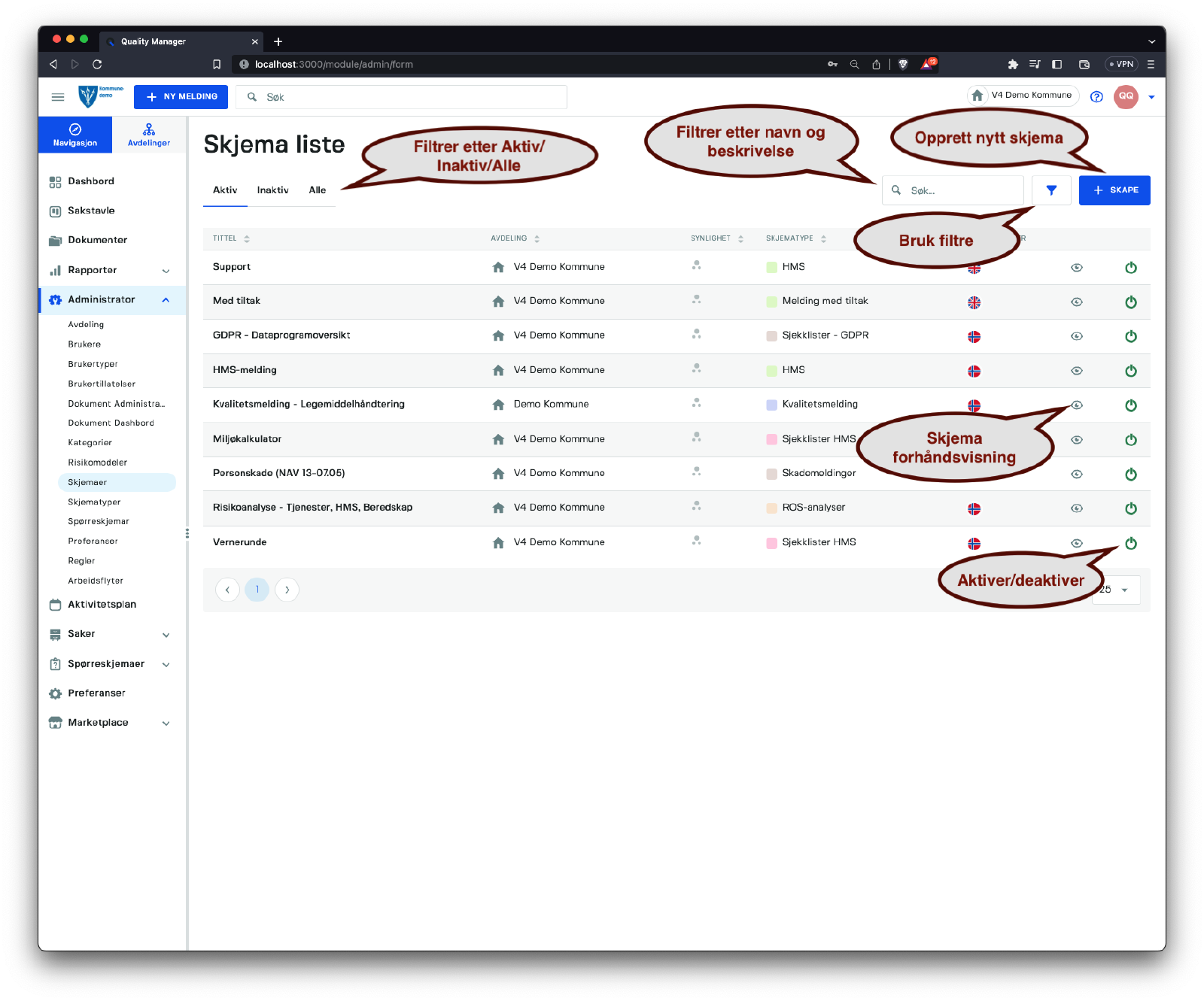 Skjemalisten viser alle skjemaer registrert i systemet. Du kan filtrere etter Aktive, Inaktive og Alle skjemaer, samt søke etter tekst. For flere filtreringsalternativer, klikk på bruk filter-knappen for å få tilgang til sidepanelet.