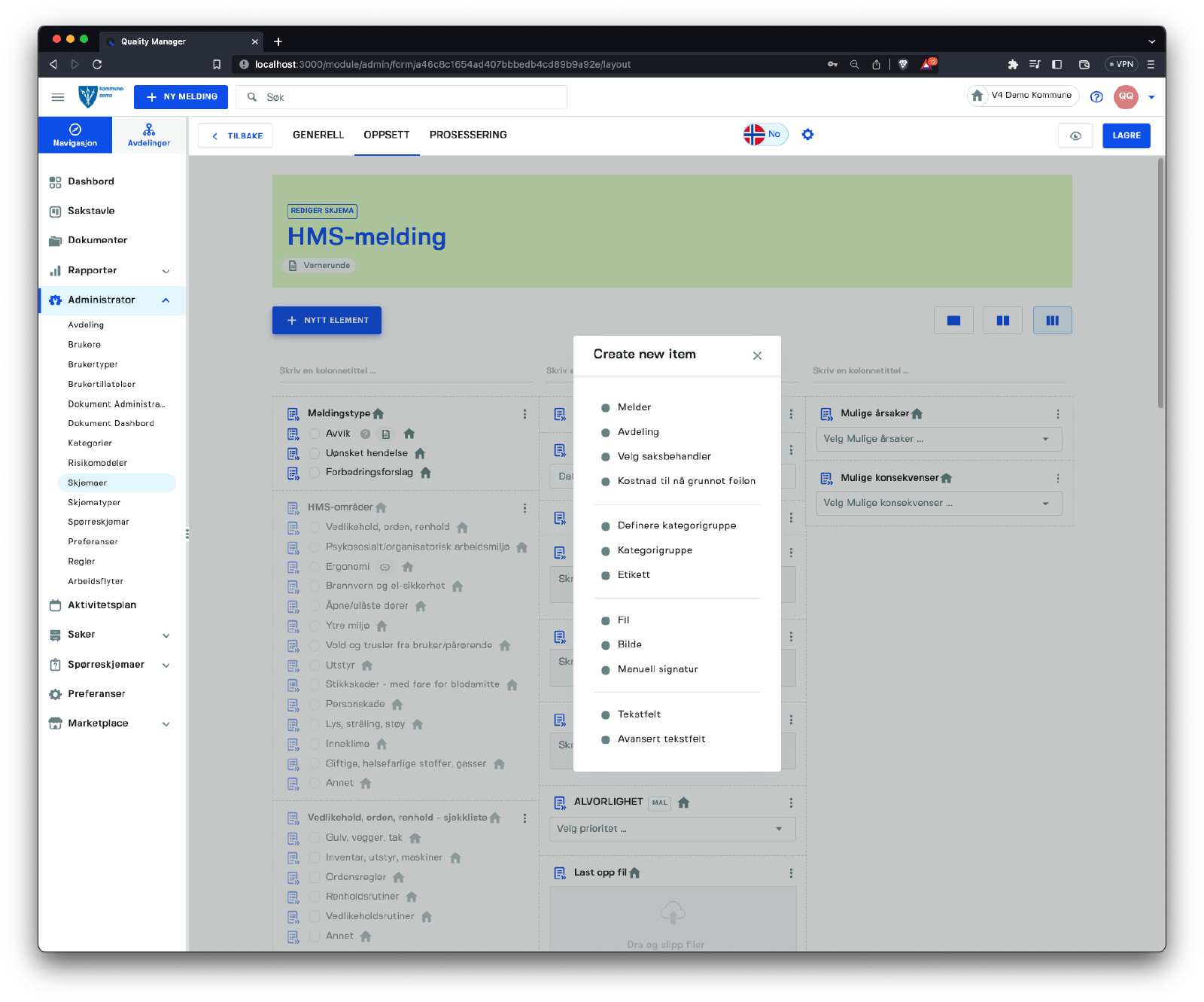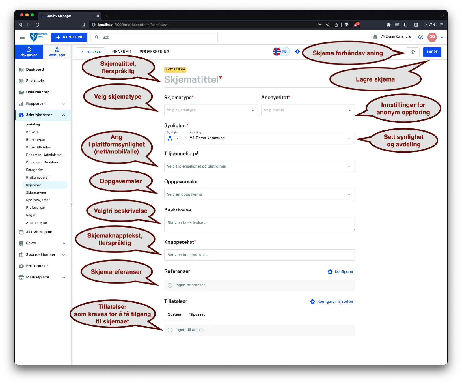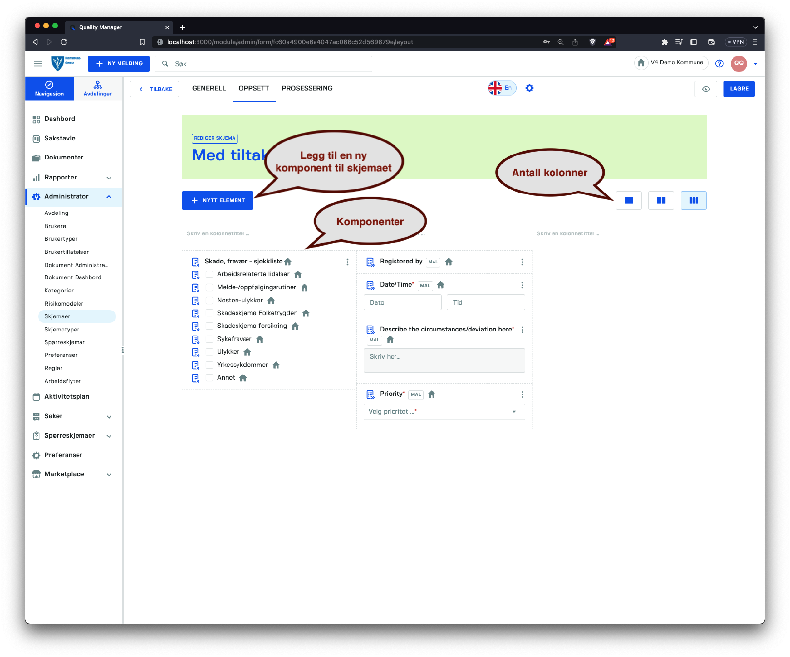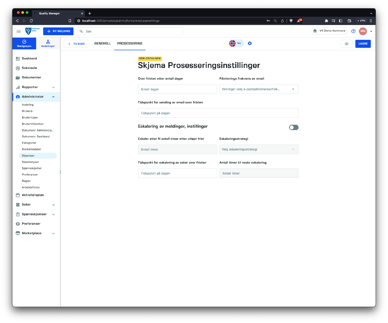 Denne seksjonen handler om å håndtere skjemaer i systemet. Få tilgang til listen over skjemaer ved å klikke på Administrator/Skjemaer.