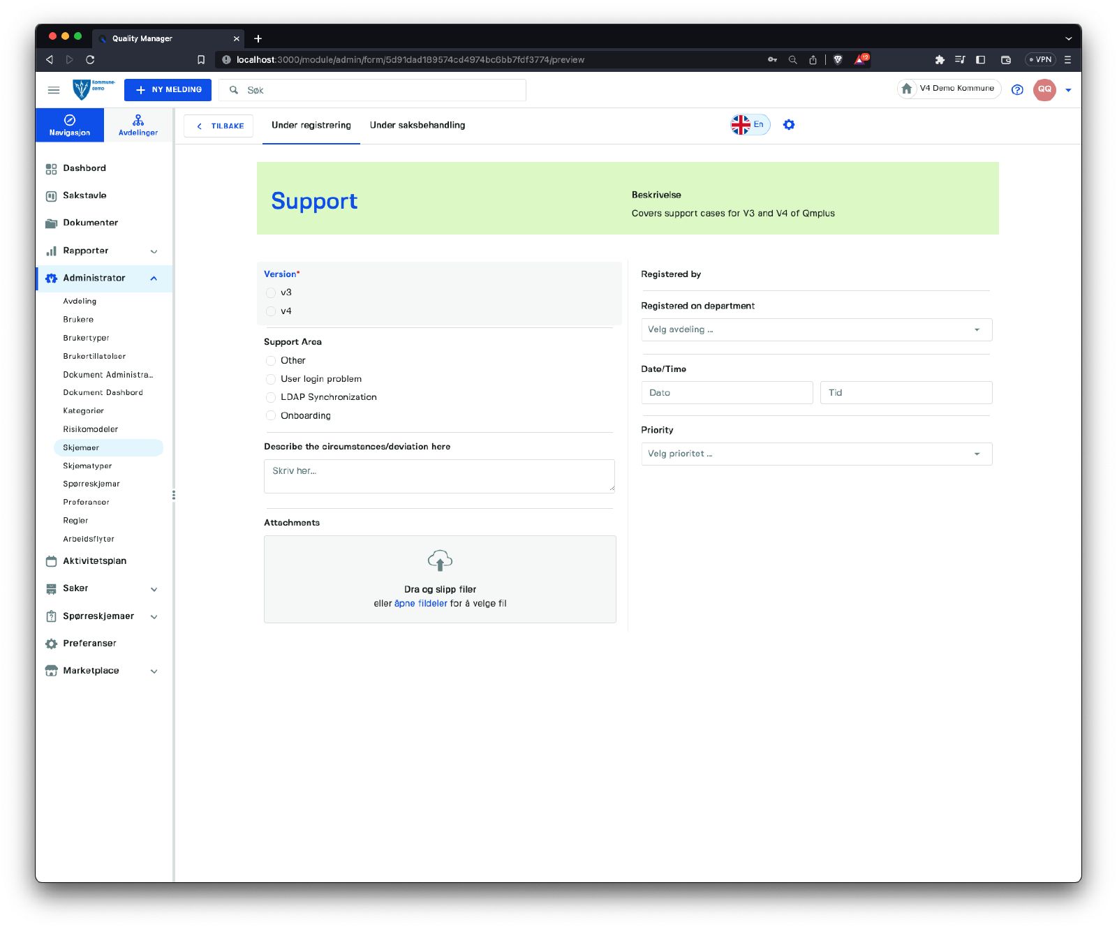 Registrert på avdeling | På hvilken avdeling skal skjemainngangen registreres. |