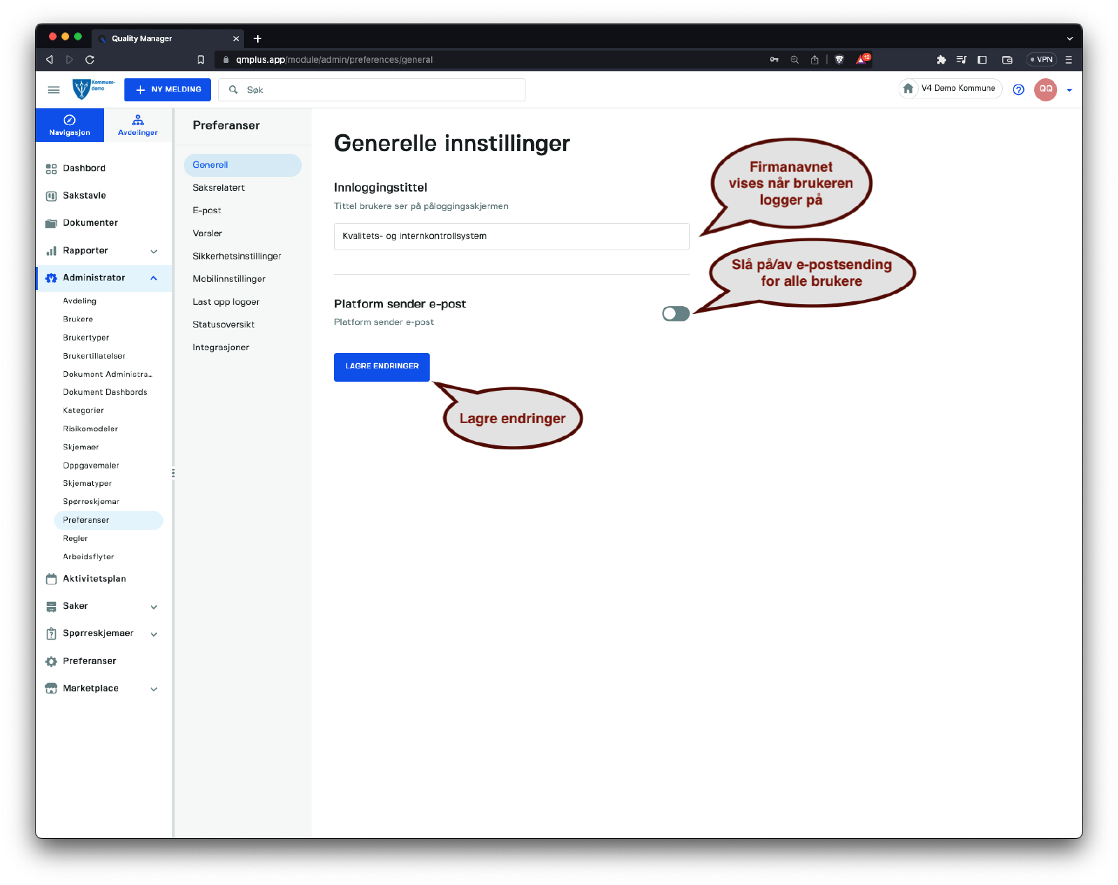 Denne delen omhandler administrasjon av innstillinger i systemet.