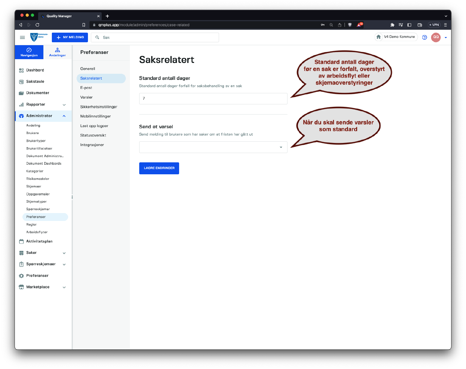 Disse preferansene kontrollerer grunnleggende forfallsdatoer og varslingsinnstillinger. Disse innstillingene kan overstyres på arbeidsflyt- og skjemanivå.