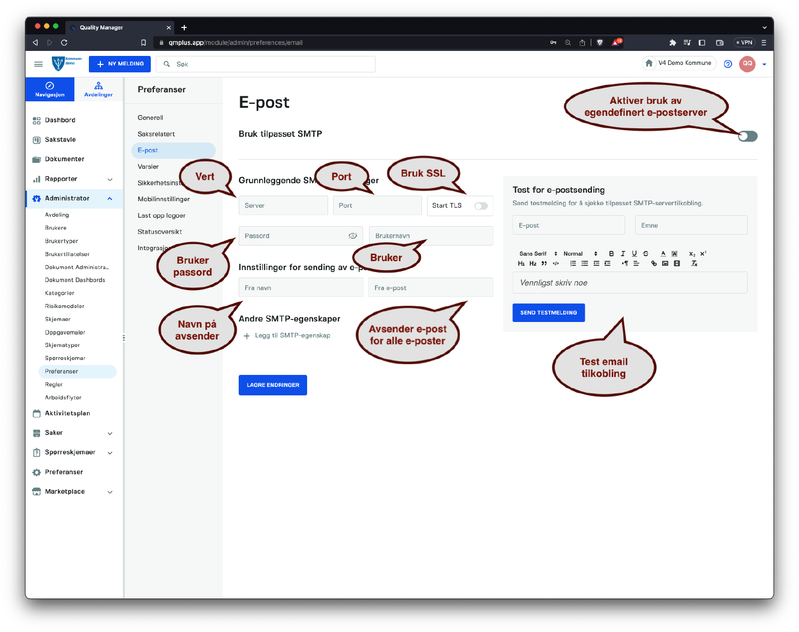 Denne delen lar deg overstyre plattformens e-postinnstillinger. Dette lar brukeren bruke sitt eget SMTP-endepunkt for å sende e-post fra Q. Dette kan være nyttig hvis kunden ønsker at varslene skal komme fra sitt eget e-postdomene eller hvis e-postinnstillingene deres forhindrer vanlig e-post fra Q i å bli levert.
