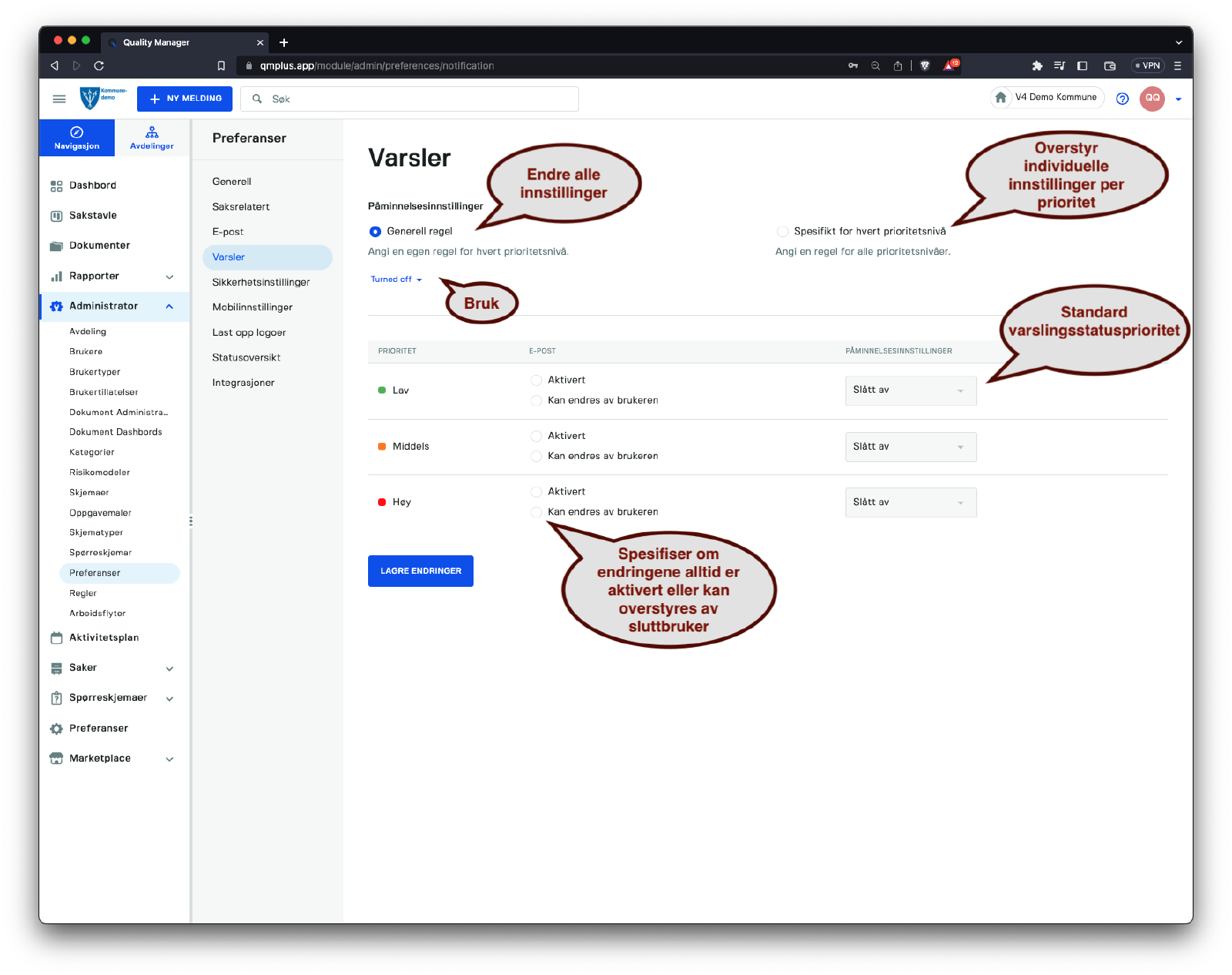 Varslingsinnstillingene lar deg angi standard varslingsinnstillinger for systemet som helhet.