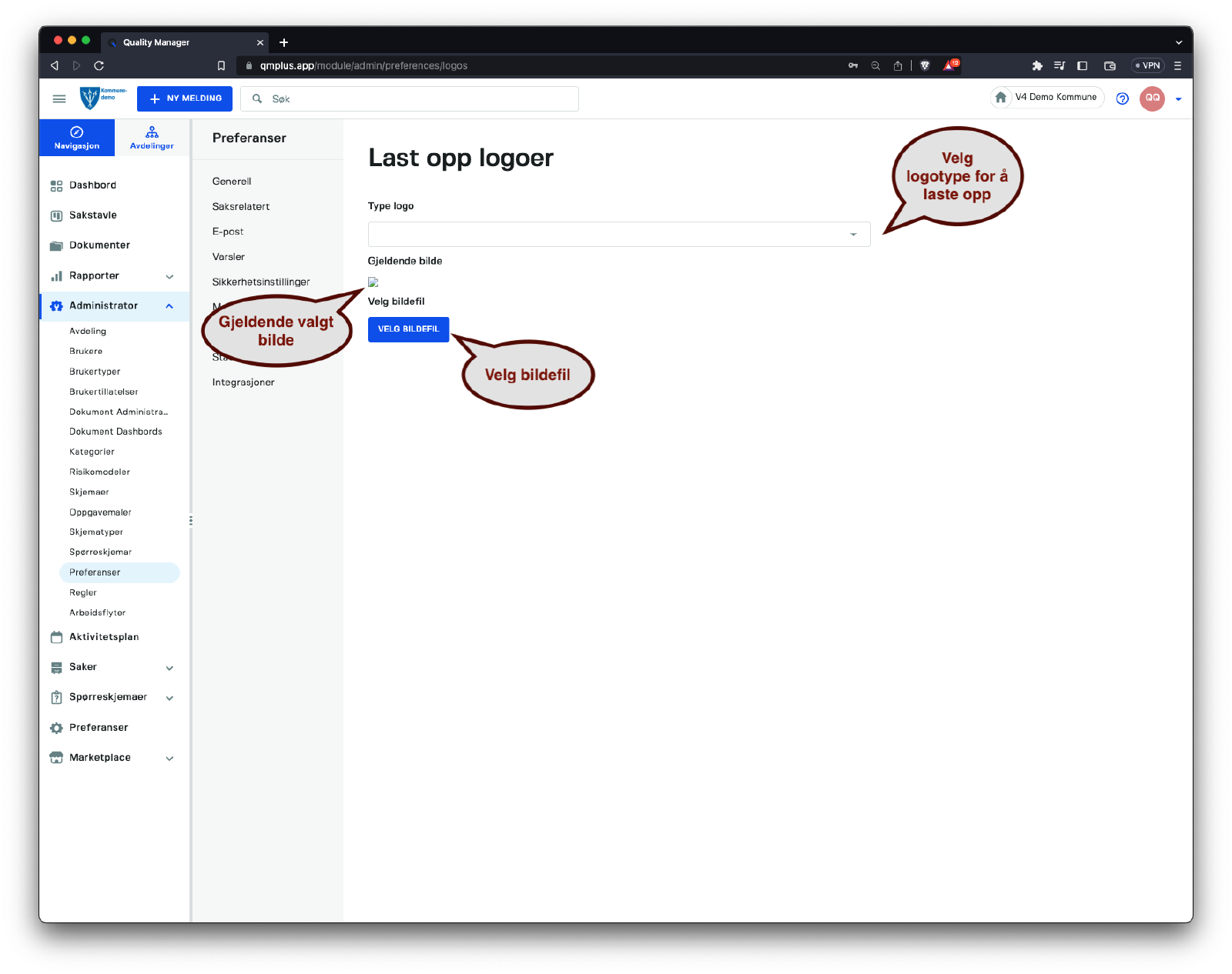Innstillingene for opplasting av logoer lar deg laste opp egendefinerte logoer som skal vises på forskjellige steder.