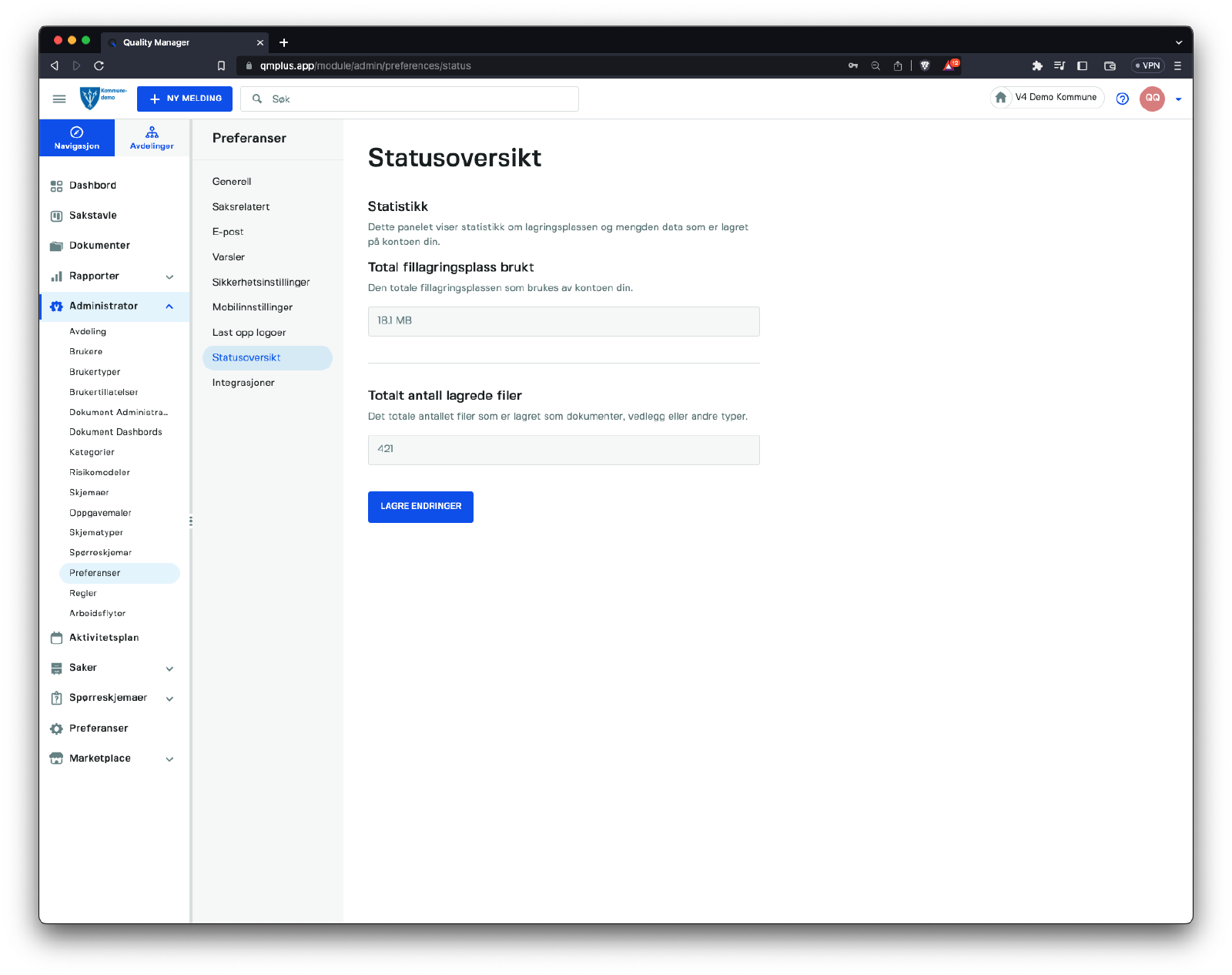Totalt antall lagrede filer | Antall lagrede filer. Dette inkluderer dokumenter så vel som vedlegg til meldinger og saker. |