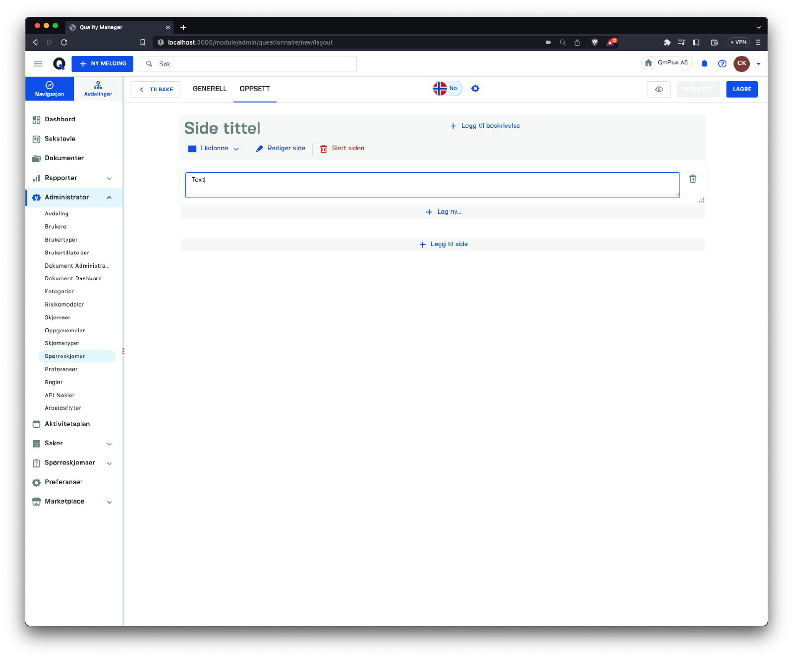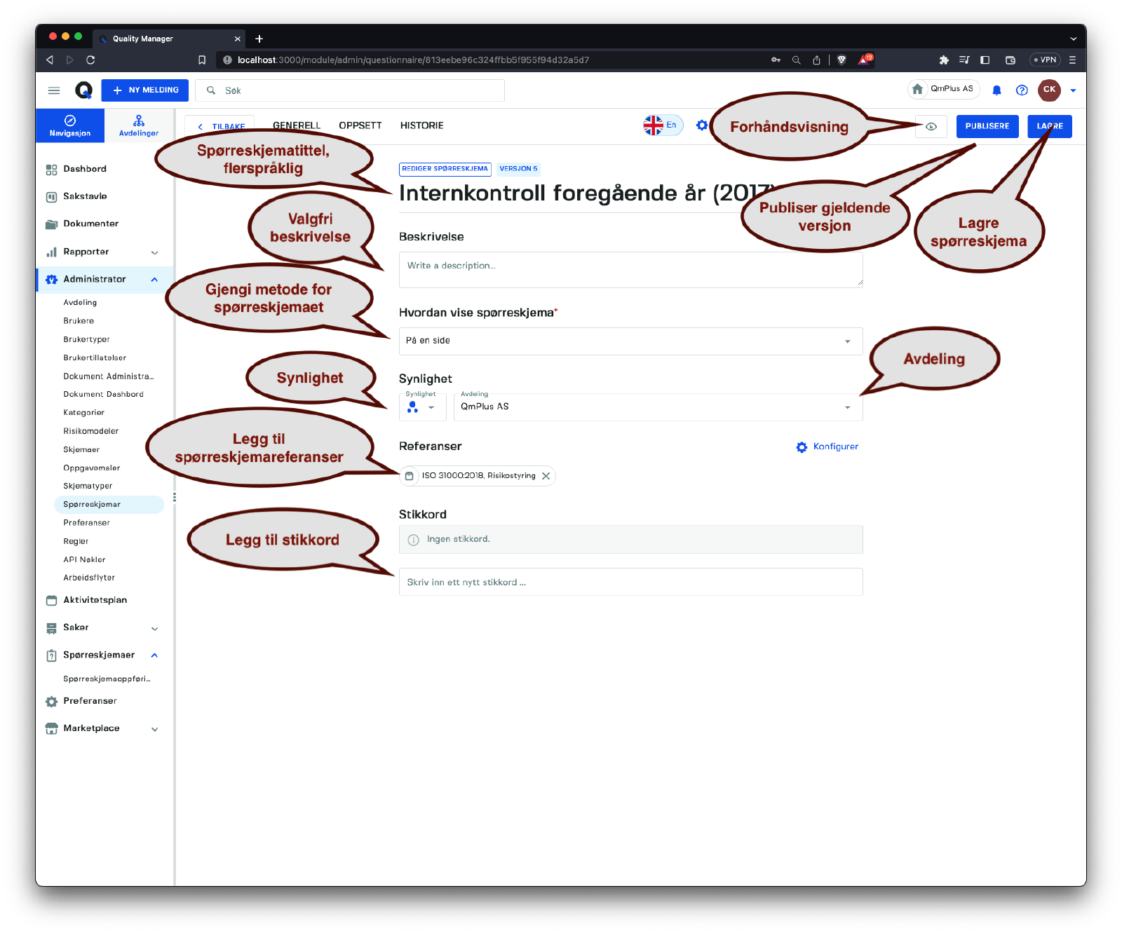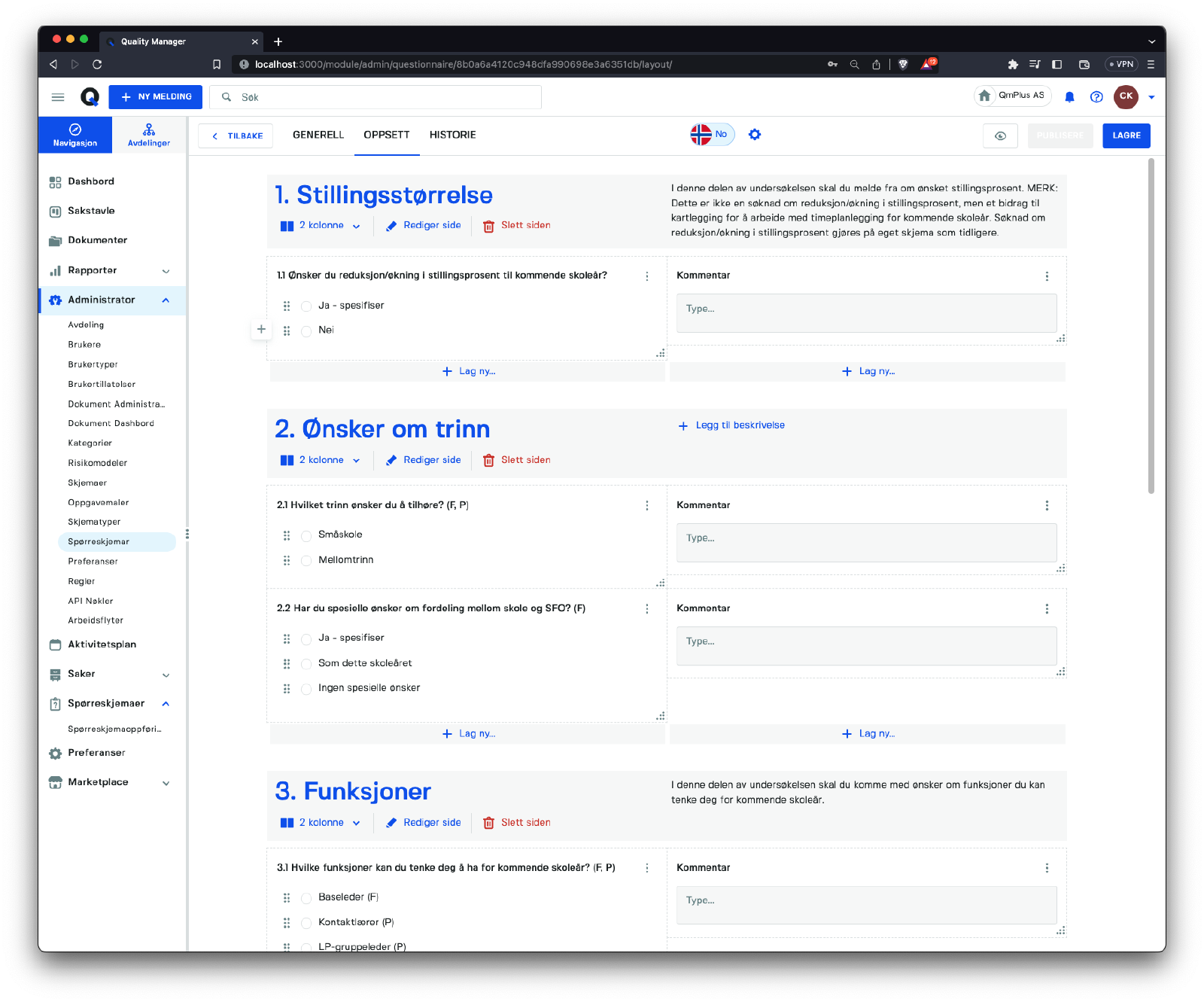 Denne seksjonen fokuserer på å administrere spørreskjemaer i systemet.