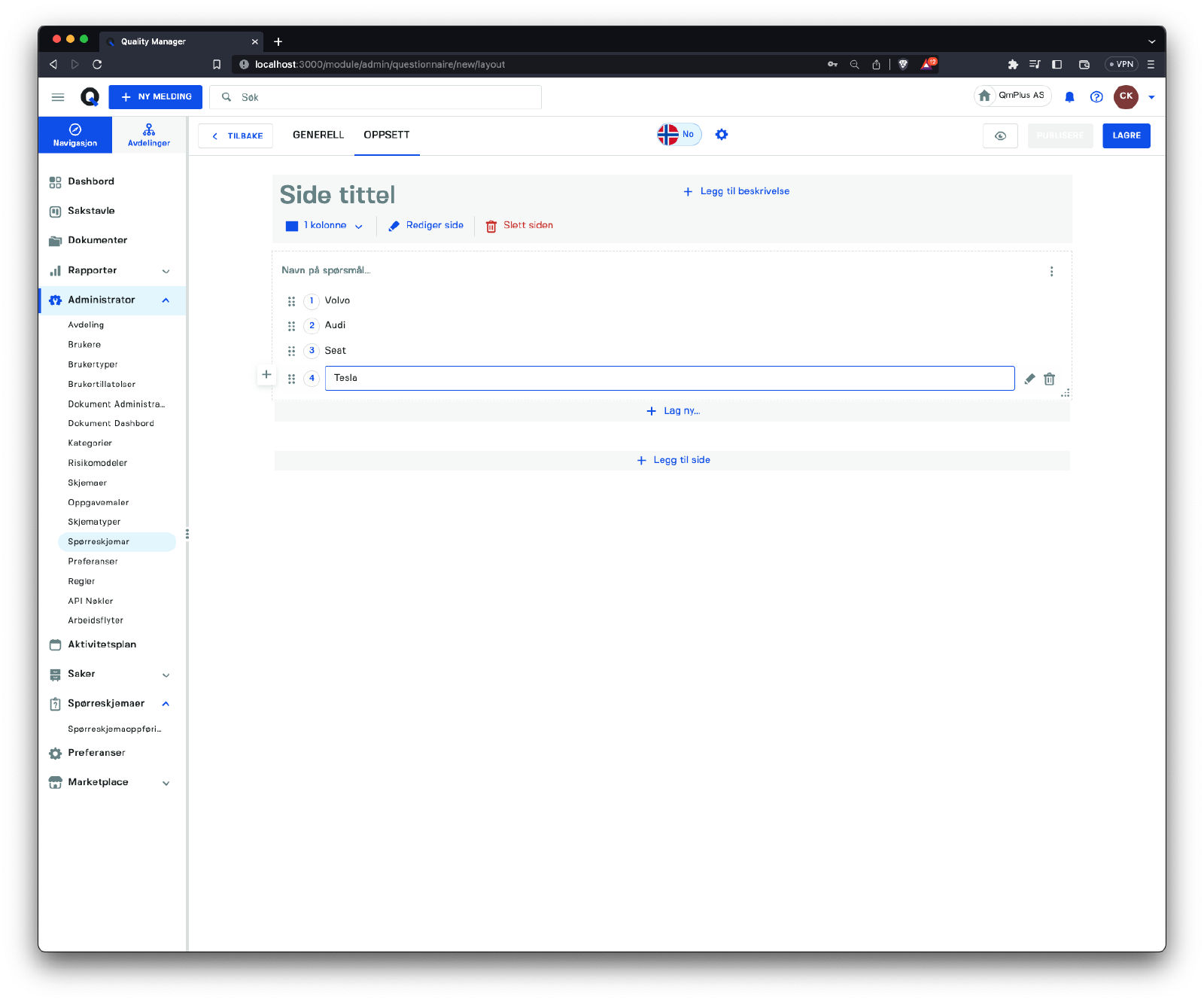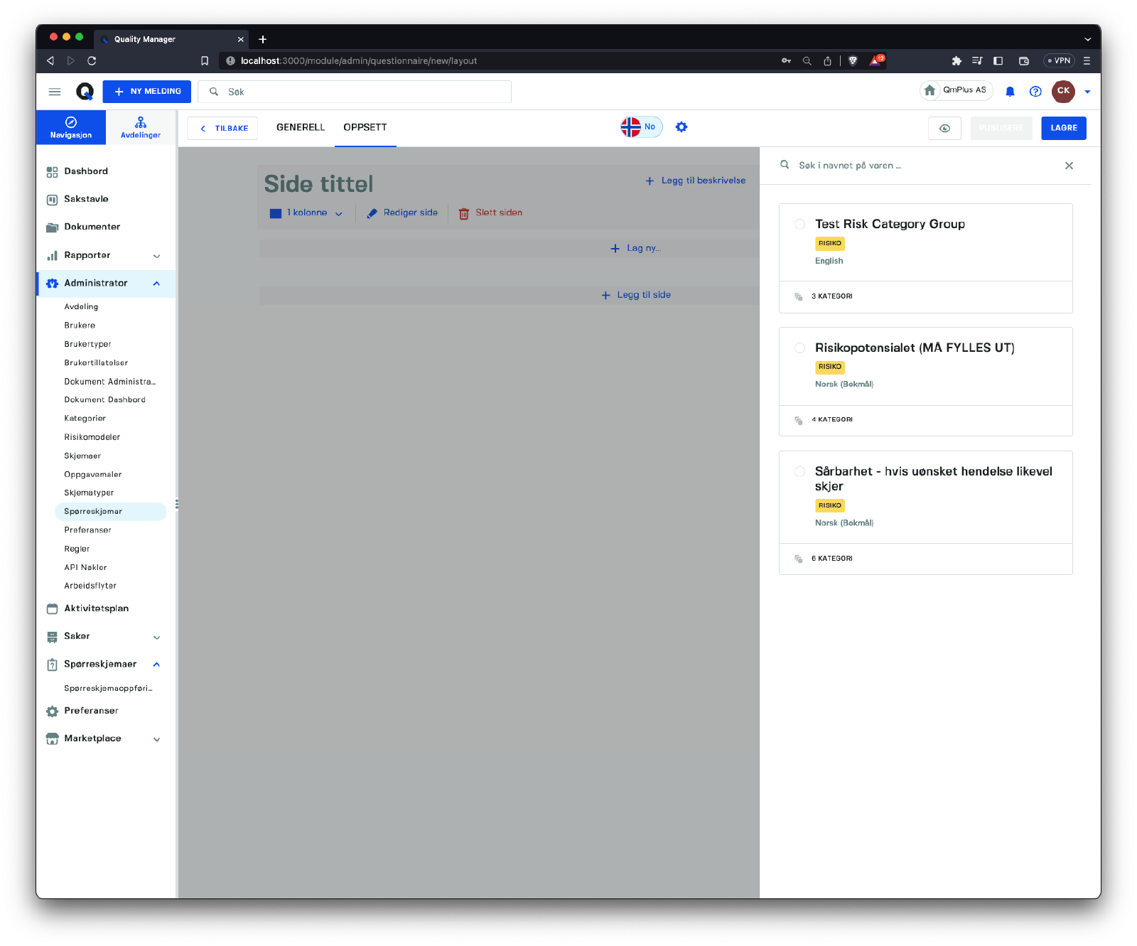Klikke på Administrator/Spørreskjemaer gir tilgang til listen over spørreskjemaer.