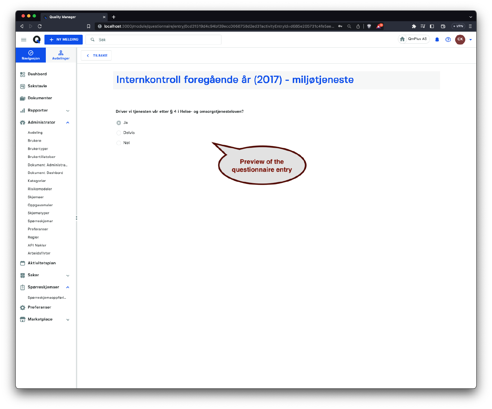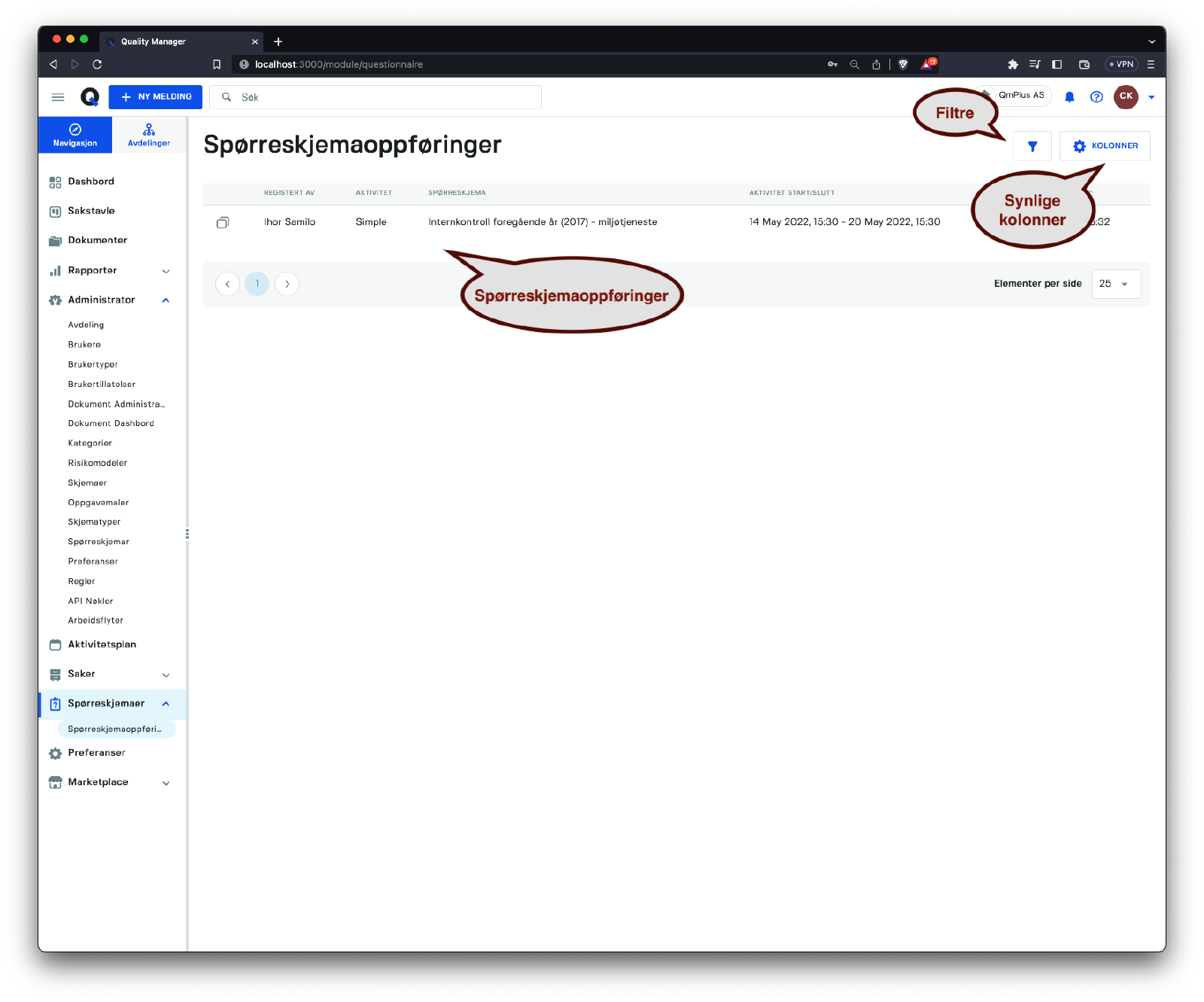 Å klikke på spørreskjemaer gir tilgang til listen over registrerte spørreskjemaer i systemet.