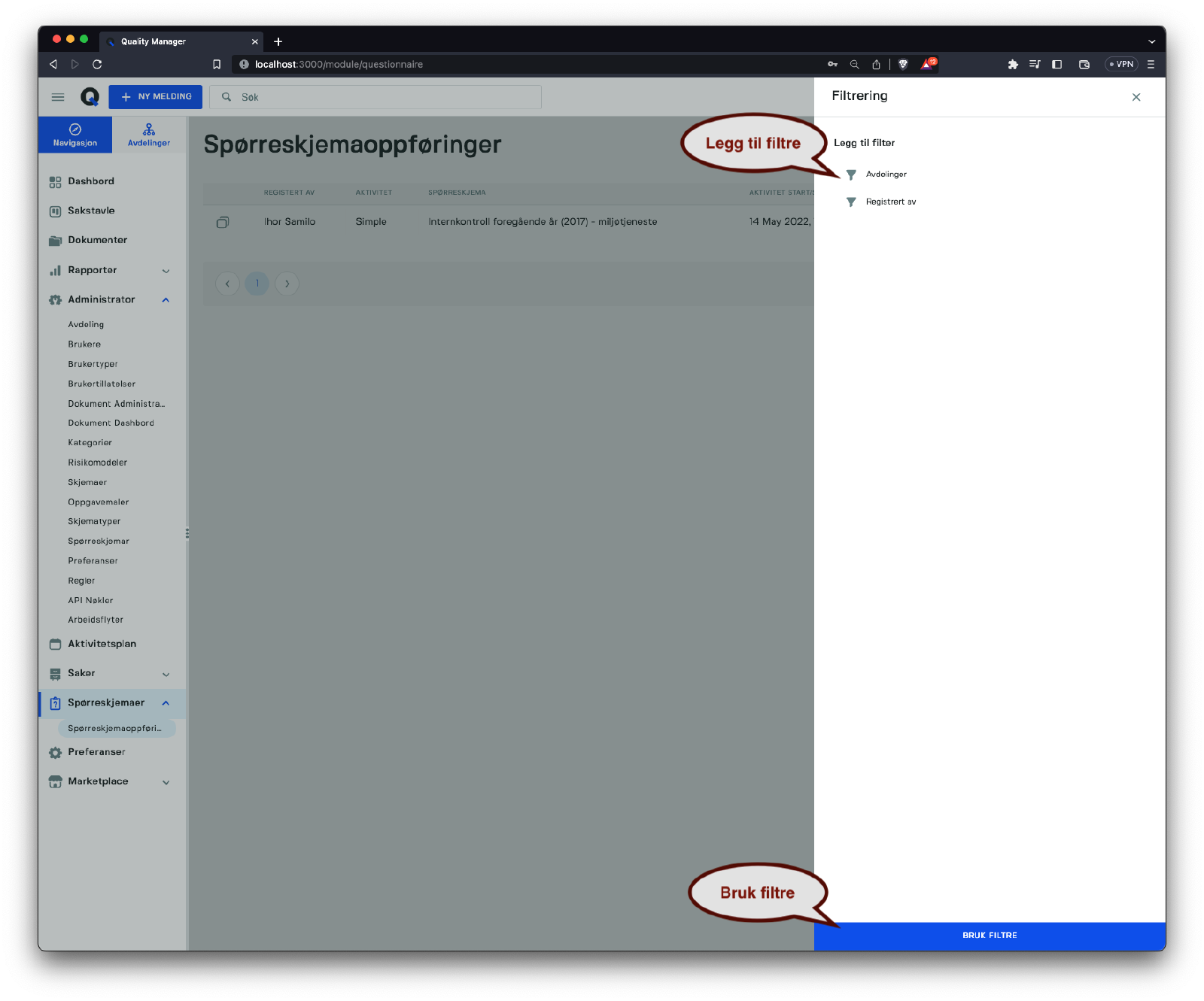 Registrert av | Velg brukerne du vil filtrere spørreskjemaene etter. |