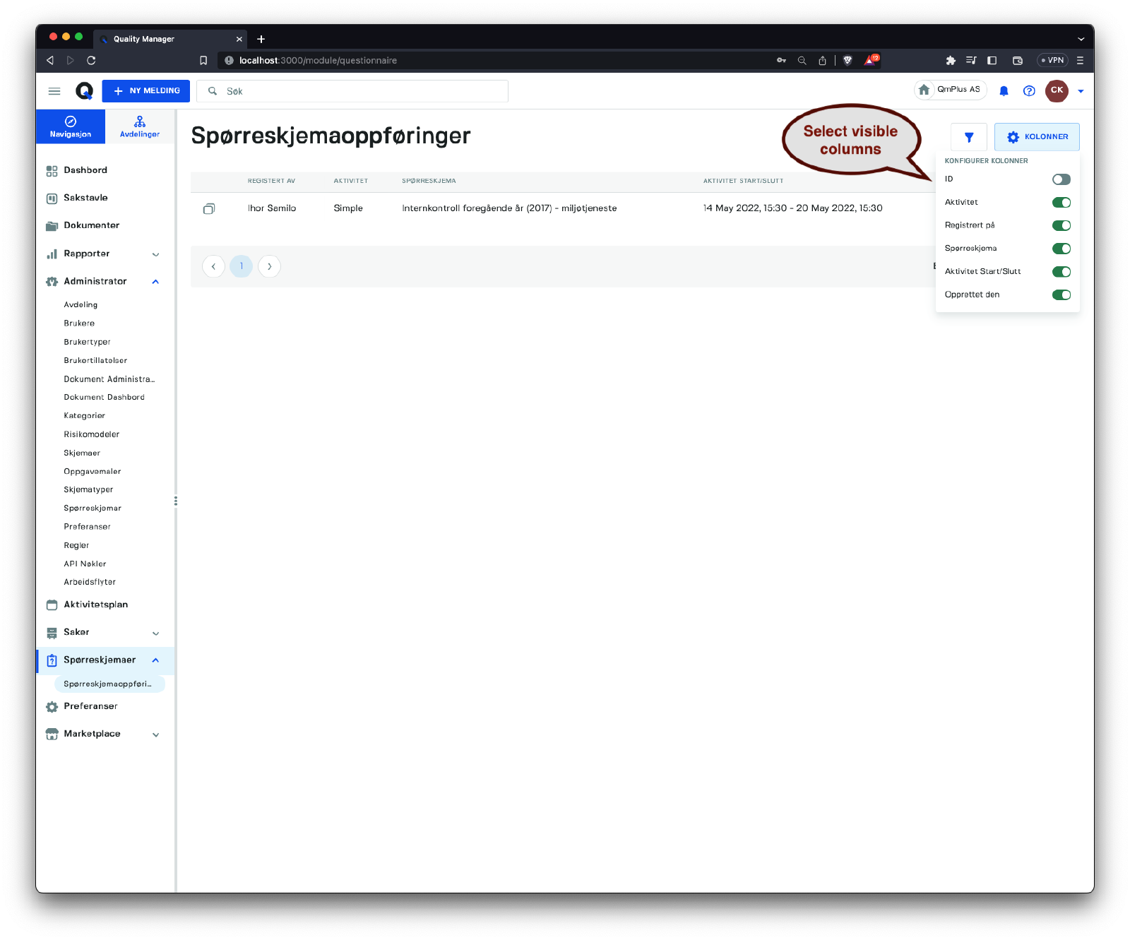 Brukere kan velge hvilke kolonner som skal være synlige i listen.