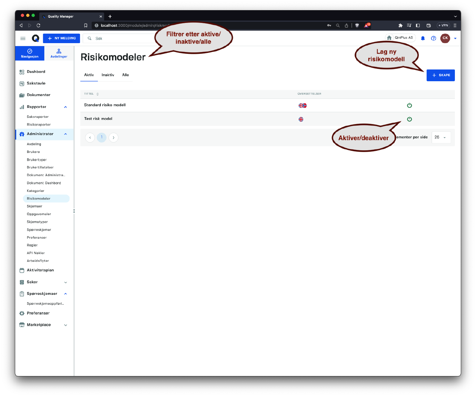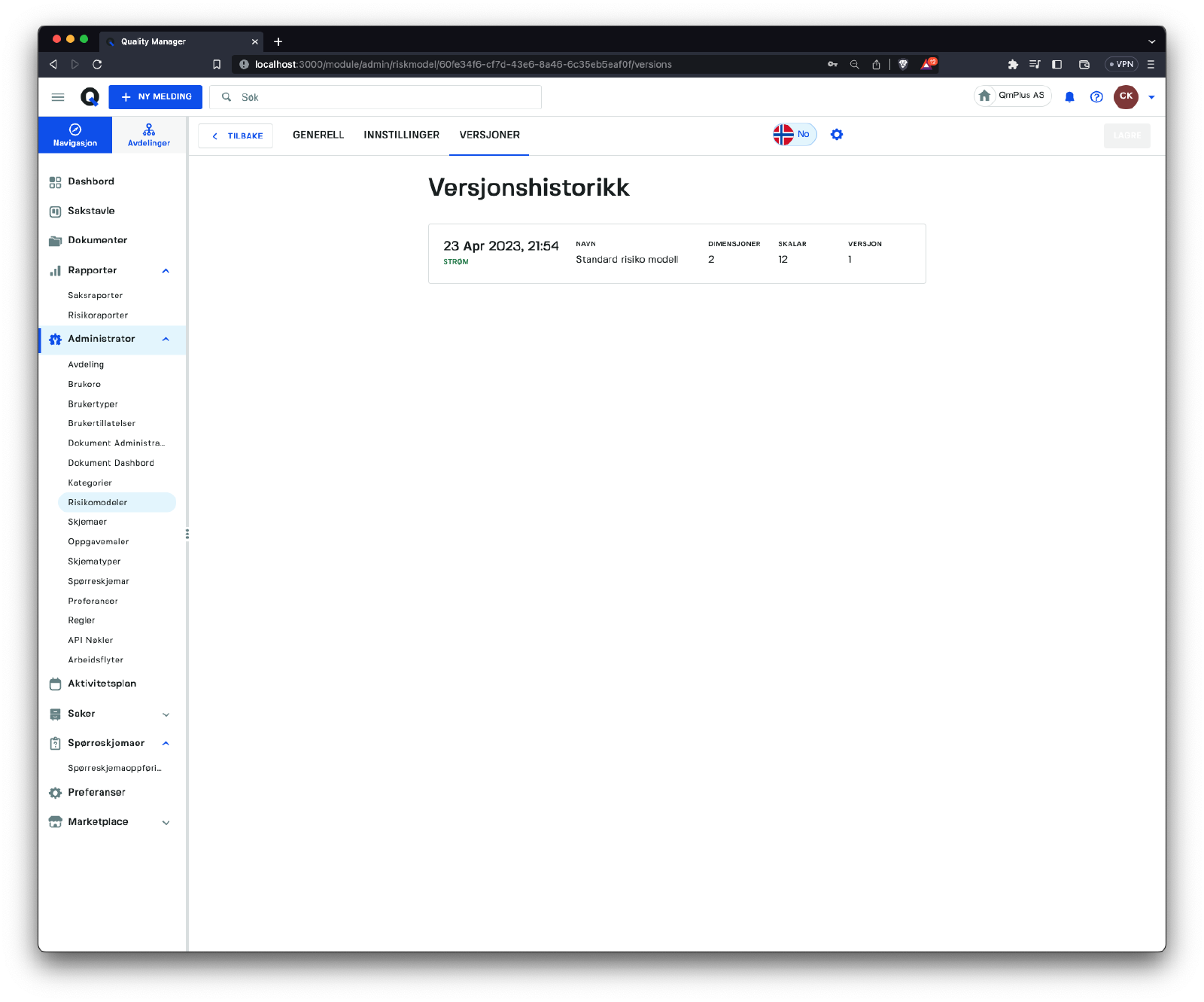 Ved å klikke på Administrator/Risikomodeler får du tilgang til listen over risikomodeller.