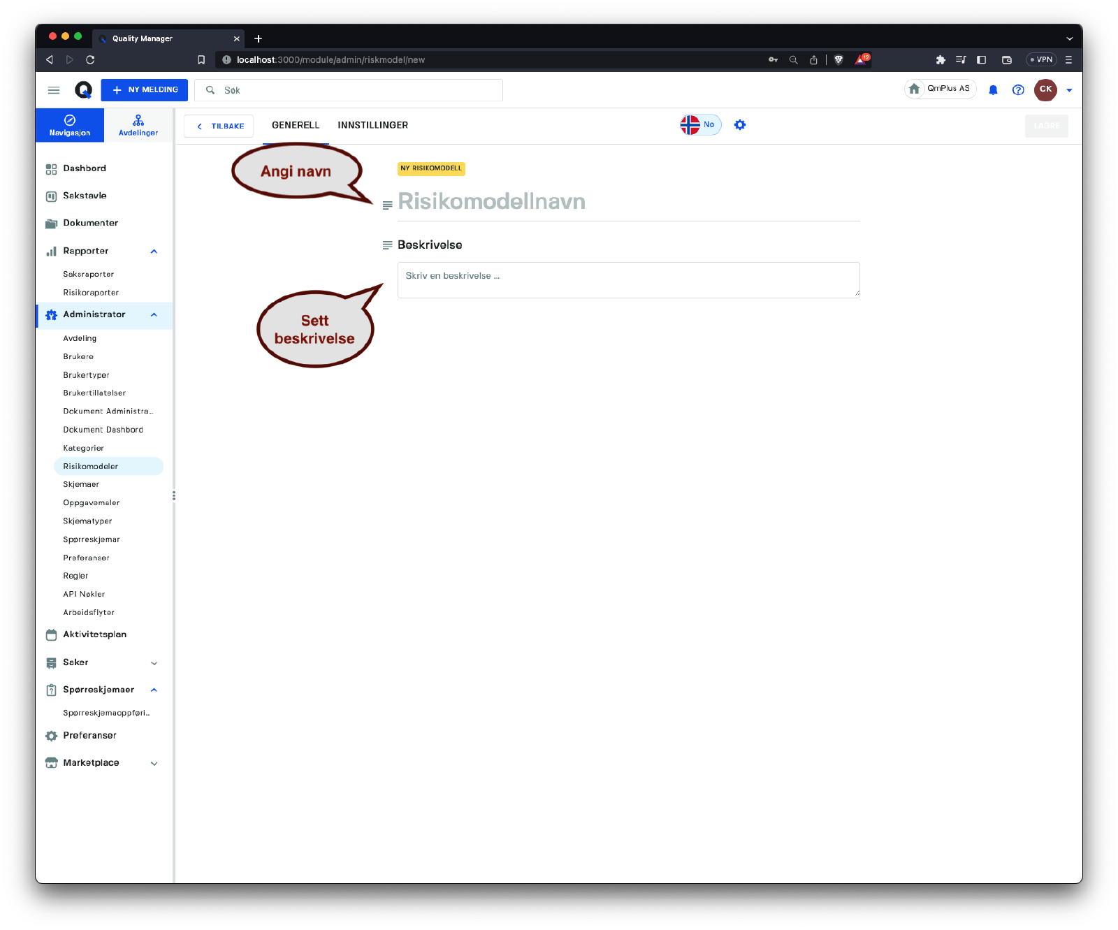 For å opprette en ny Risikomodell må vi angi et navn for risikomodellen (den støtter flere språk). Man kan også legge til en valgfri beskrivelse for modellen.