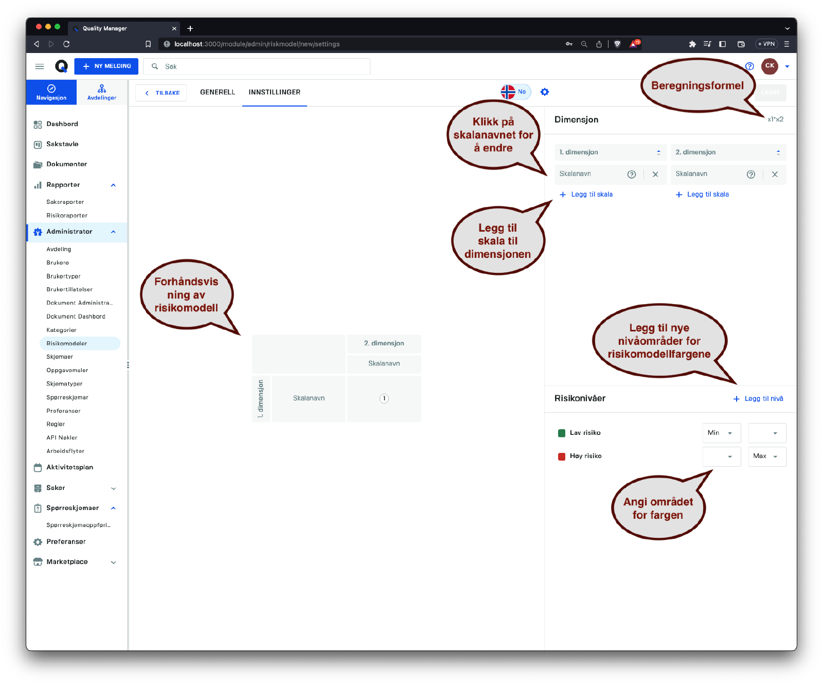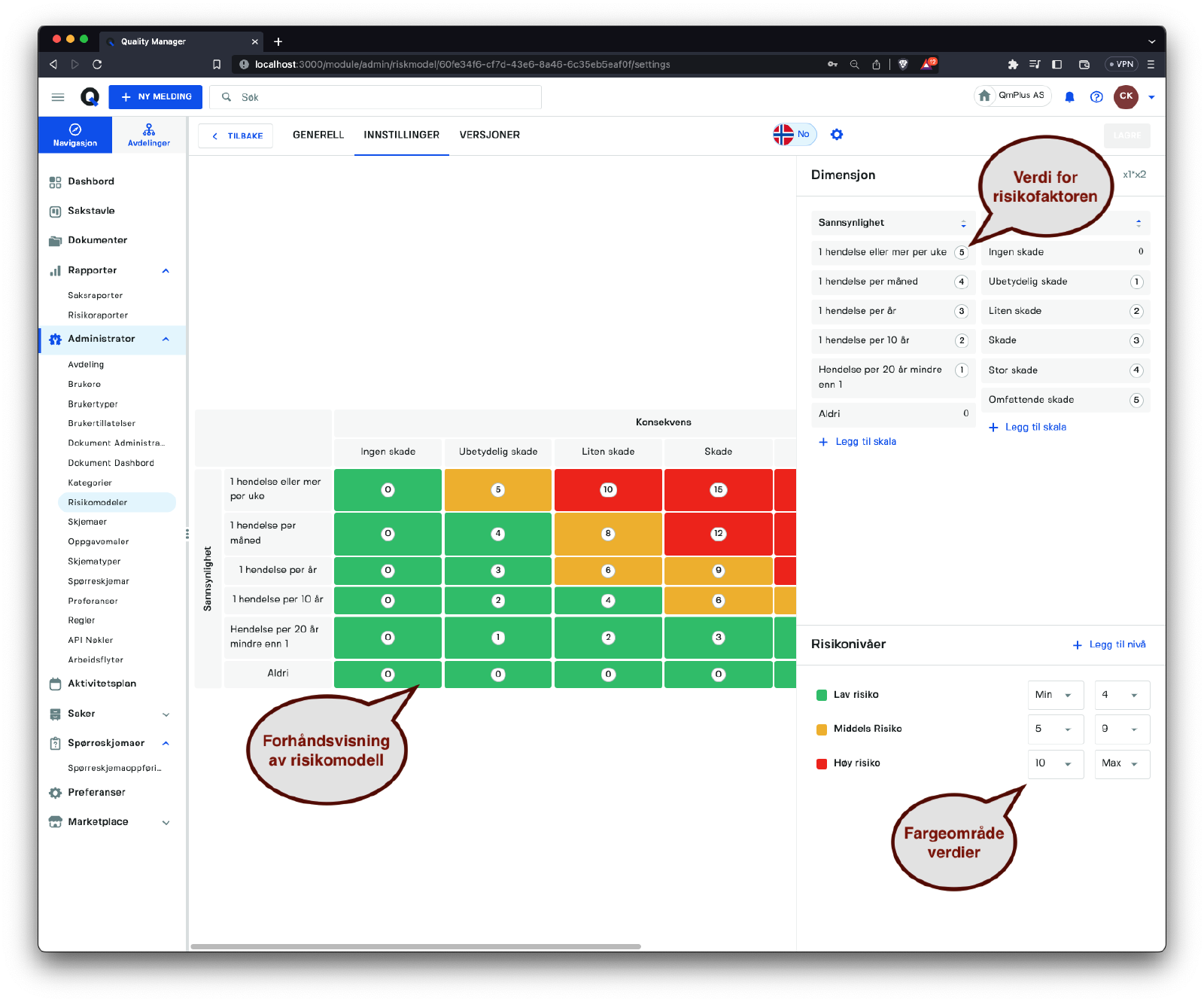 Når man legger inn en risikoverdi, vil brukeren velge en verdi fra hver dimensjon, og plattformen vil deretter beregne en tilsvarende risikoverdi avhengig av formelen knyttet til risikomodellen.