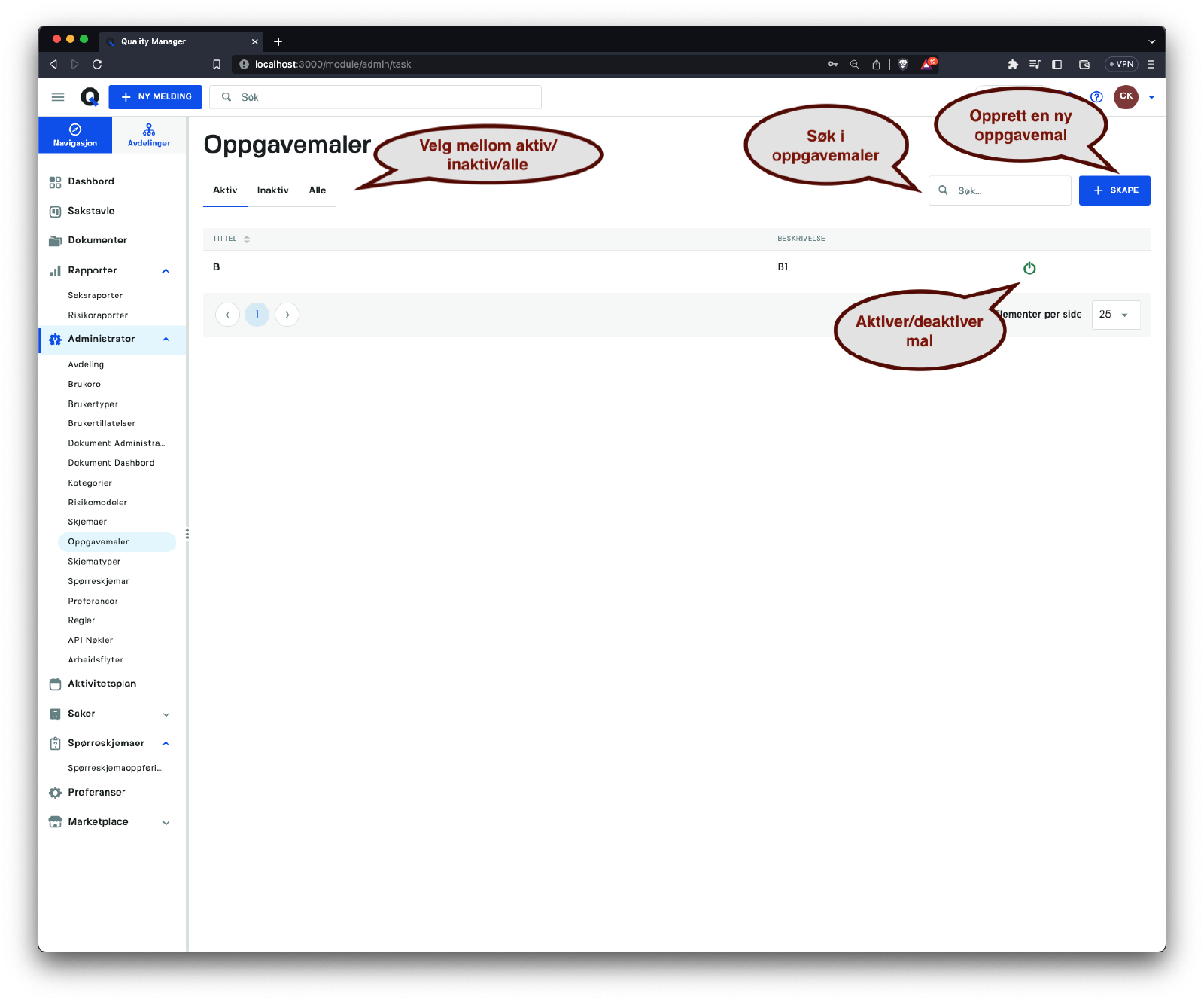 Ved å klikke på Administrator/Oppgavemaler, får du tilgang til listen over oppgavemaler.