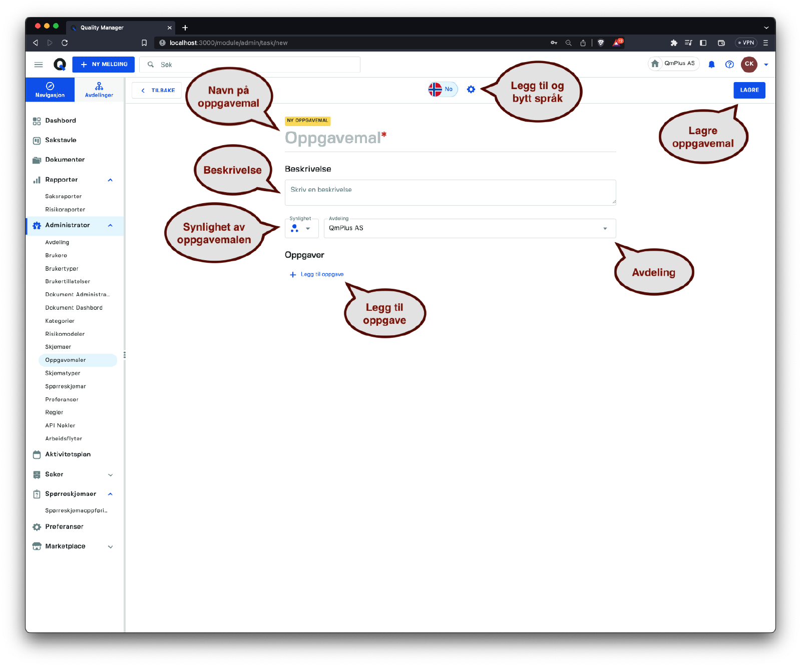 Denne delen omhandler administrasjon av oppgavemaler i systemet.