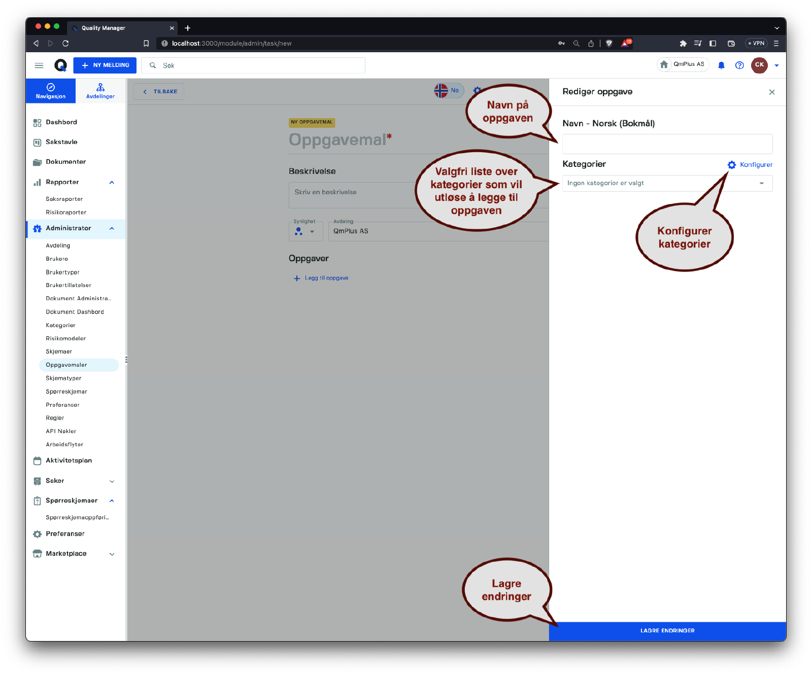 Klikk på Konfigurer-knappen for å hente listen over tilgjengelige kategorier. Til slutt, klikk på Lagre endringer-knappen for å lagre Oppgaven i Oppgavemalen.