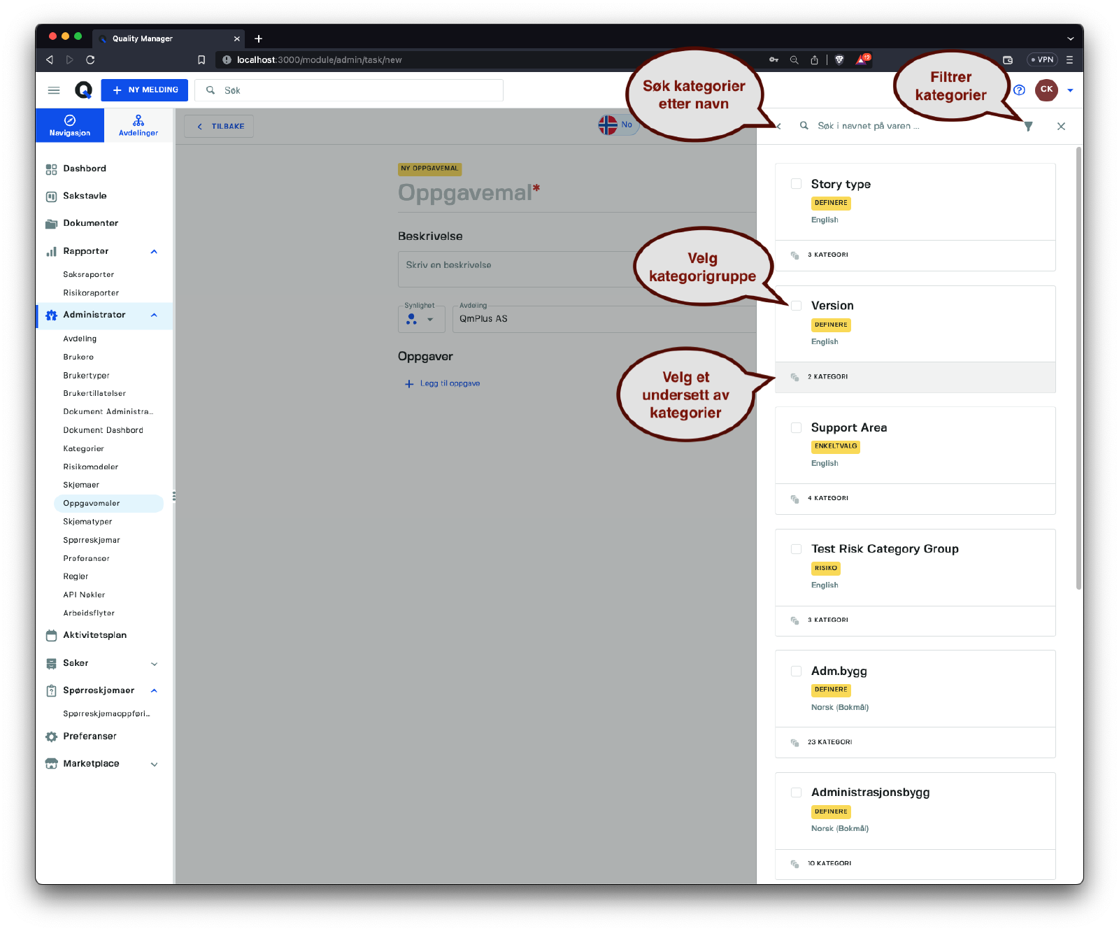 Kategorier | Liste over kategorier som vil utløse tillegg av denne spesifikke oppgaven til en ny Sak når en skjemamelding er registrert. |