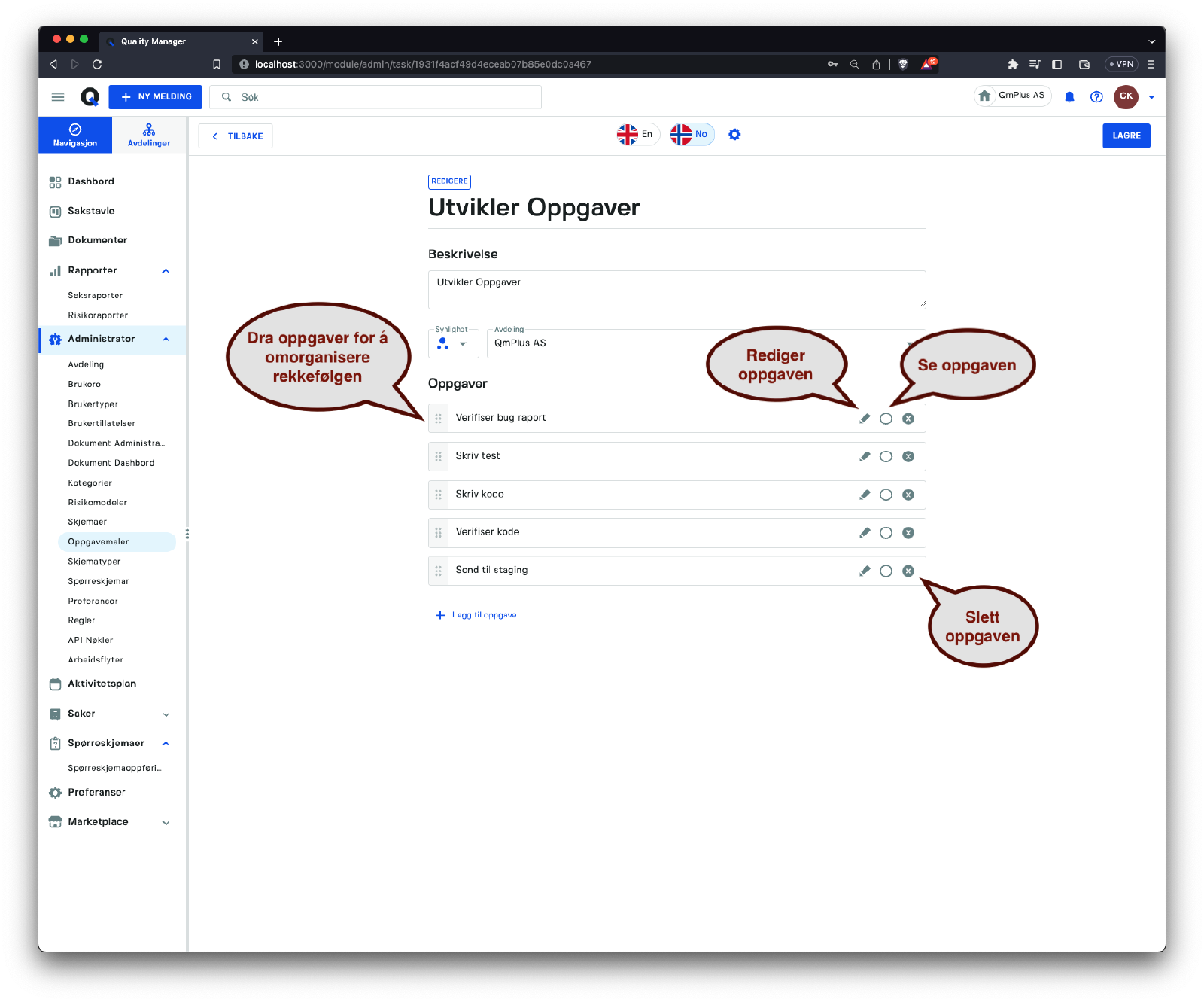 Du kan også Redigere, Vise og Slette individuelle oppgaver i Oppgavemalen.
