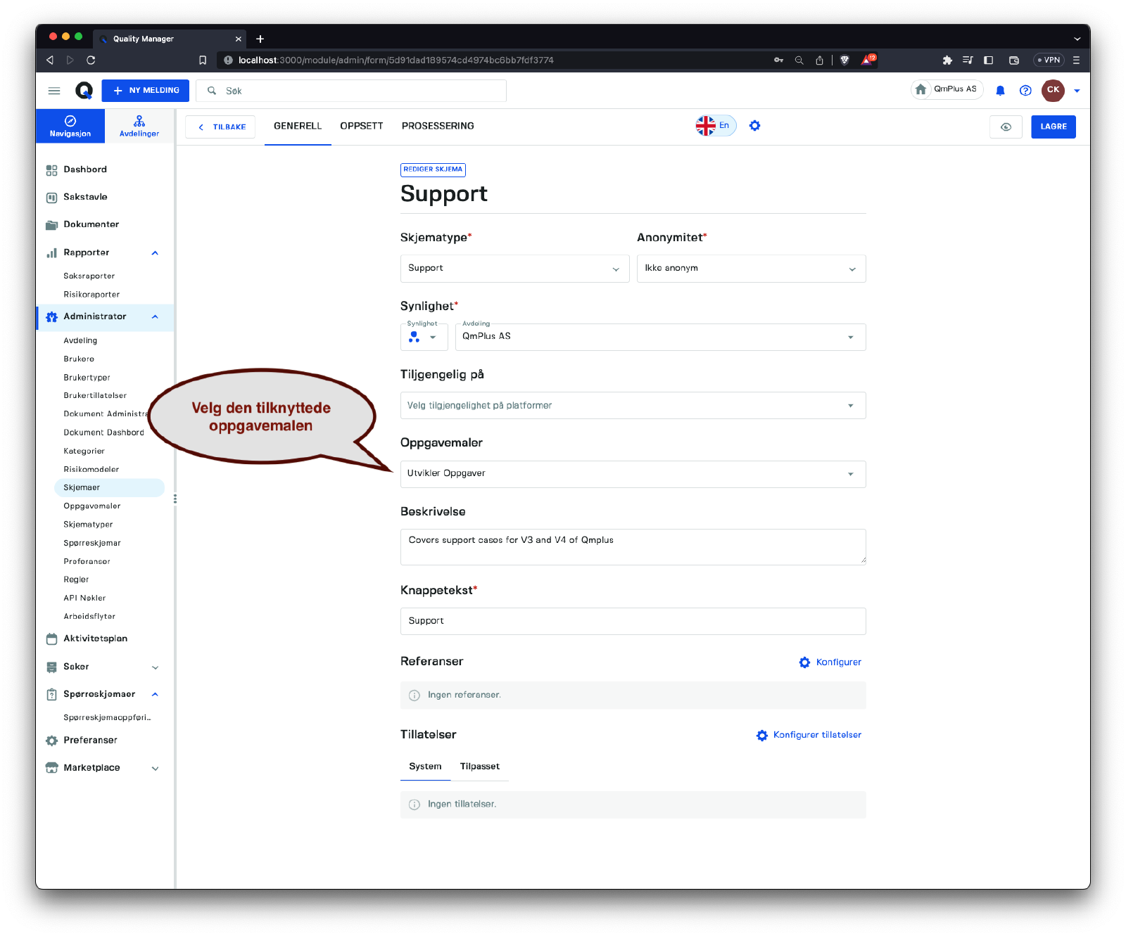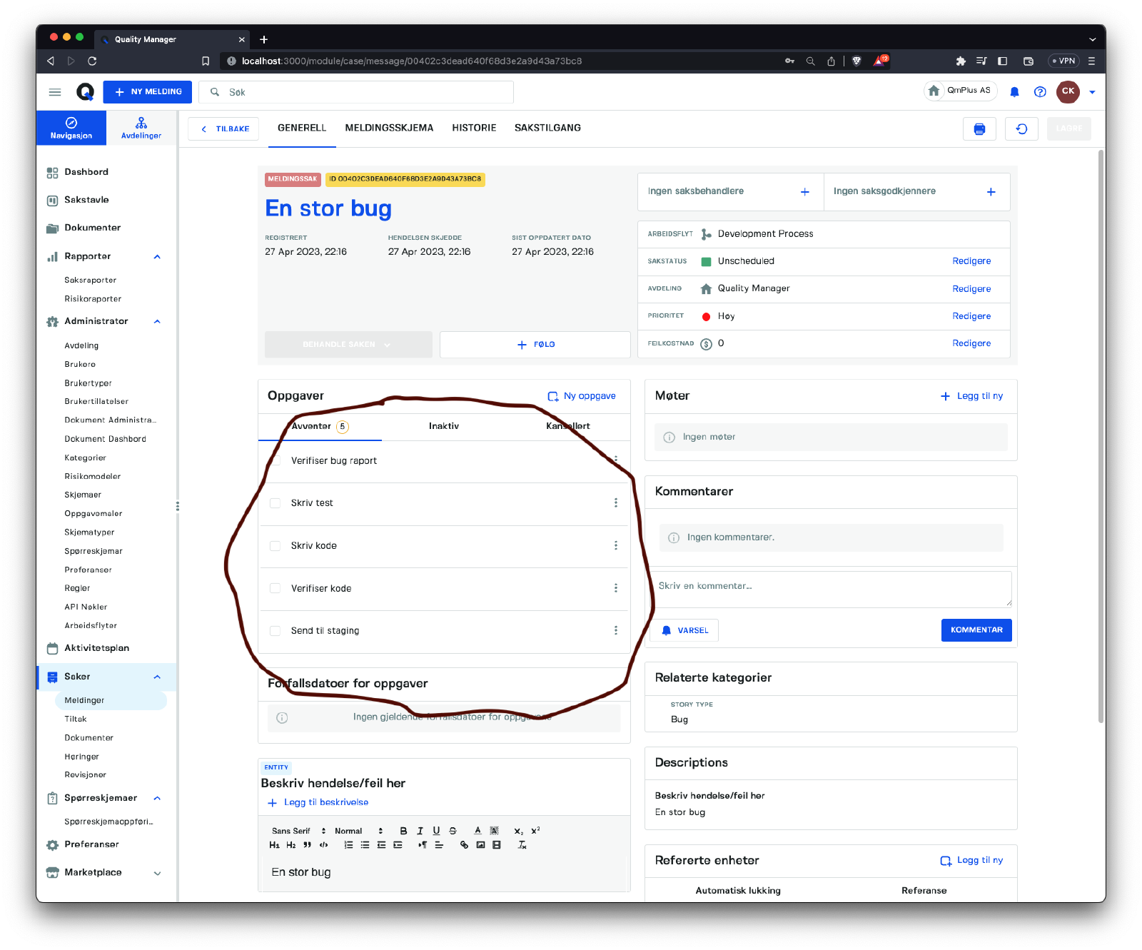 Når en bruker registrerer en ny melding ved hjelp av dette skjemaet, vil den resulterende Saken inkludere en liste over Oppgaver basert på den tilknyttede Oppgavemalen. Dette sikrer at passende oppgaver genereres for hver sak i henhold til de forhåndsdefinerte malene, og bidrar til å opprettholde konsistens og overholdelse av organisatoriske prosesser.