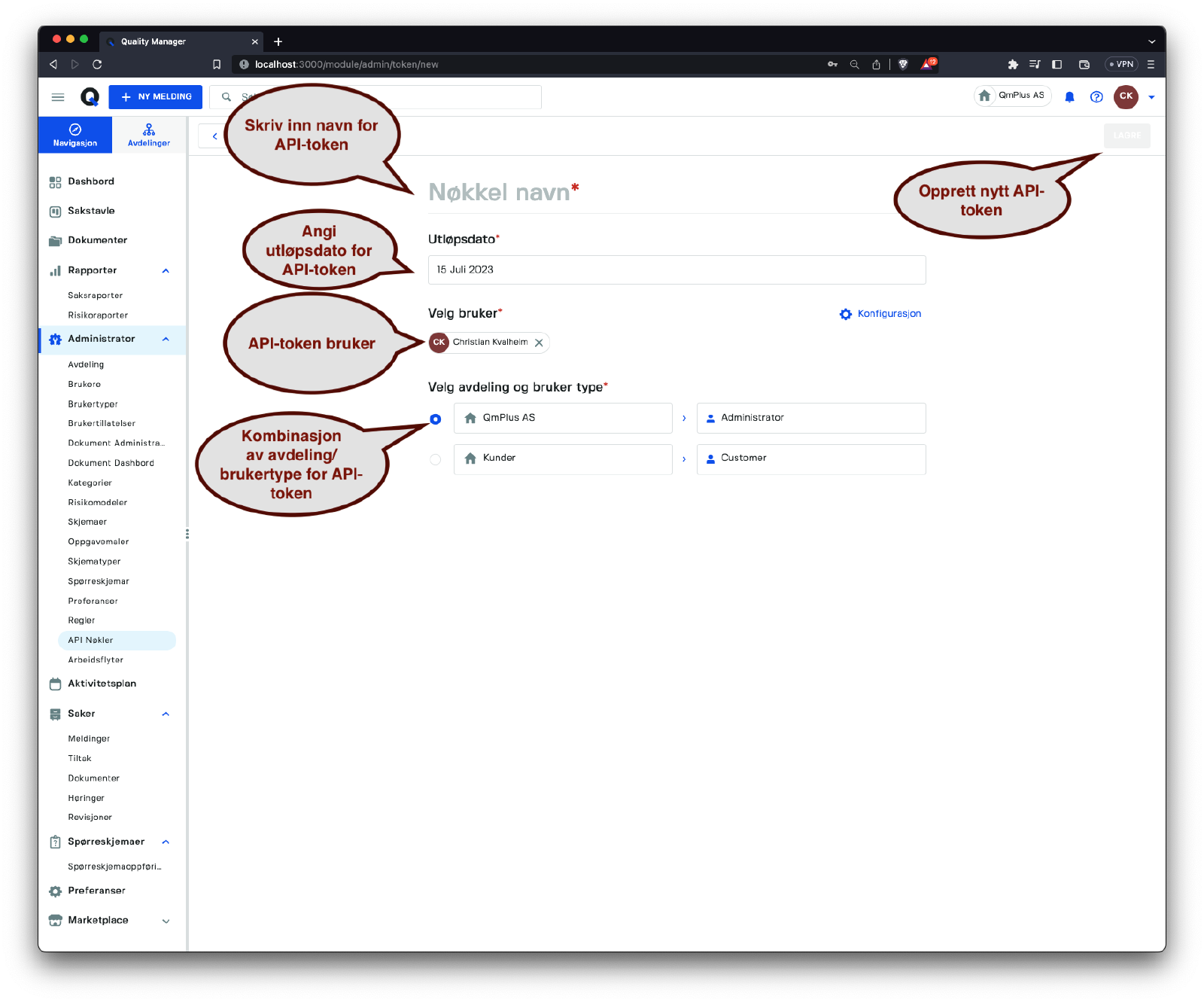 Du kan opprette nye API Tokens for integrasjon. Følgende felt må fylles ut.
