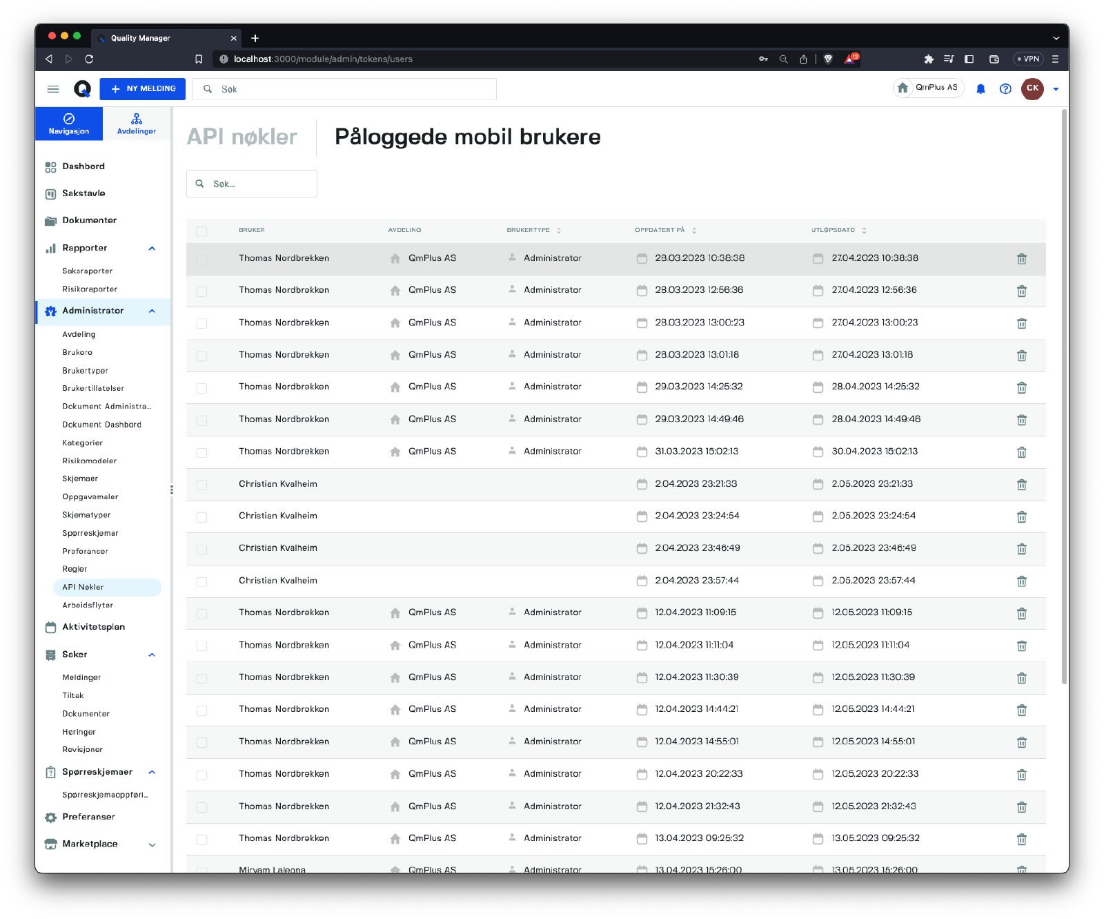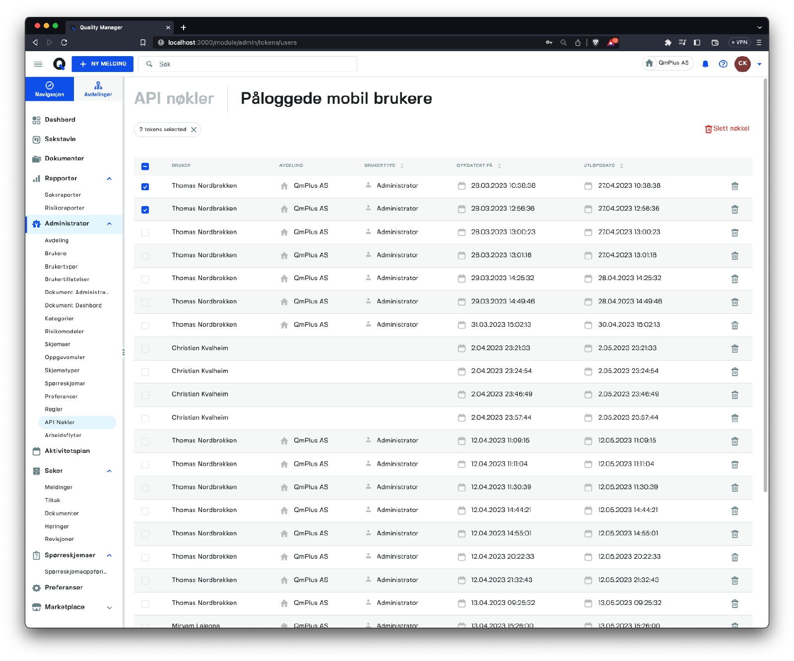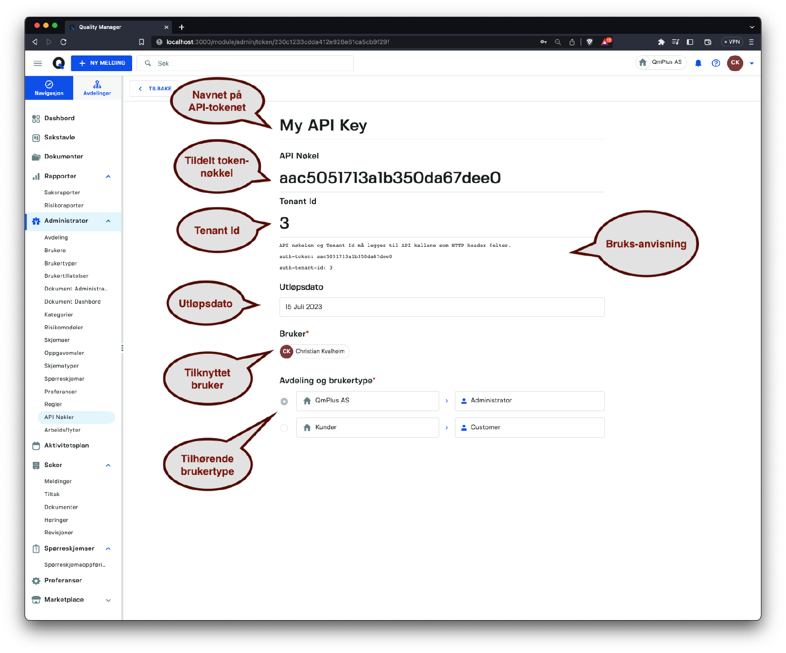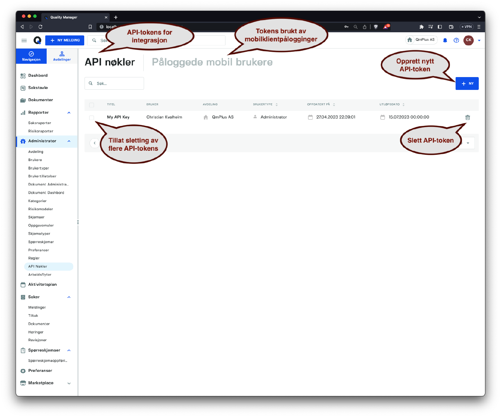 API Tokens | Tokens som brukes til å integrere med systemet ved hjelp av eksterne applikasjoner eller kode. |