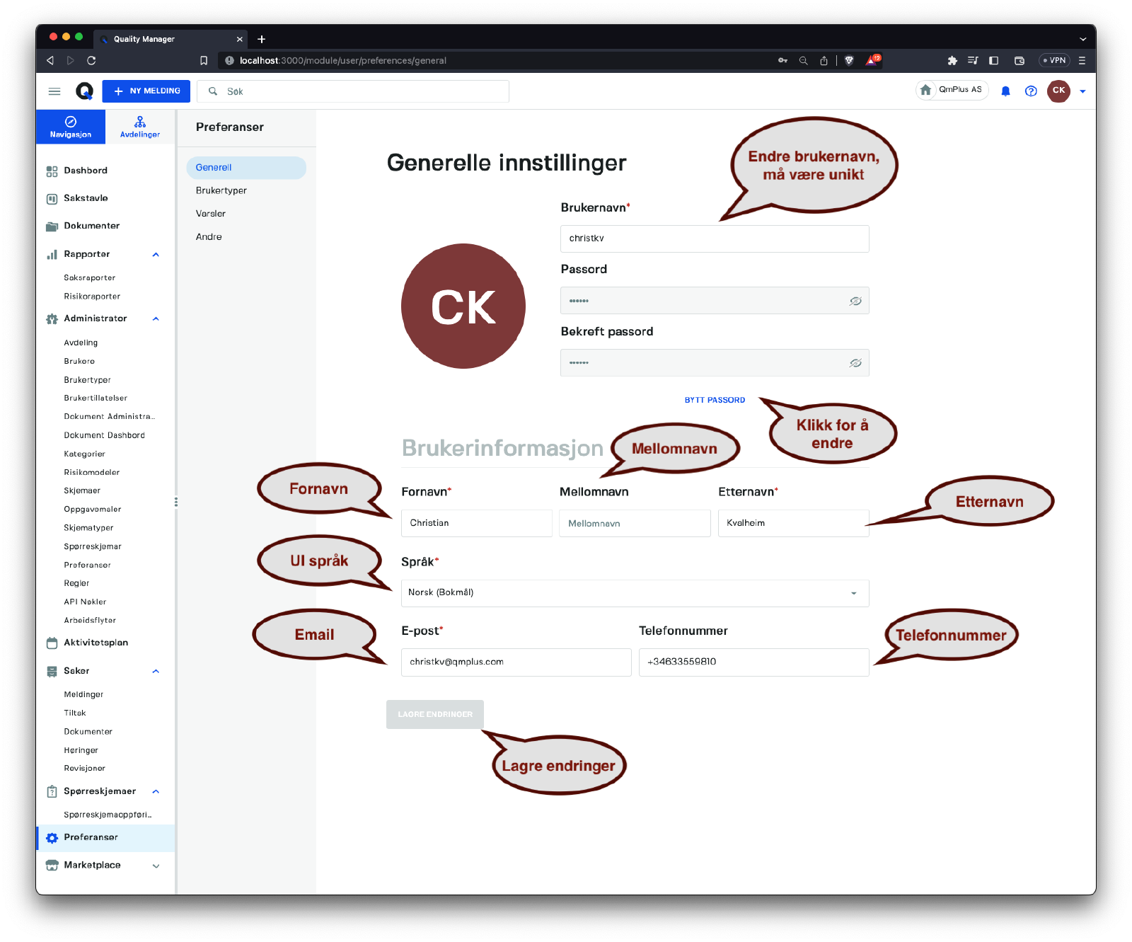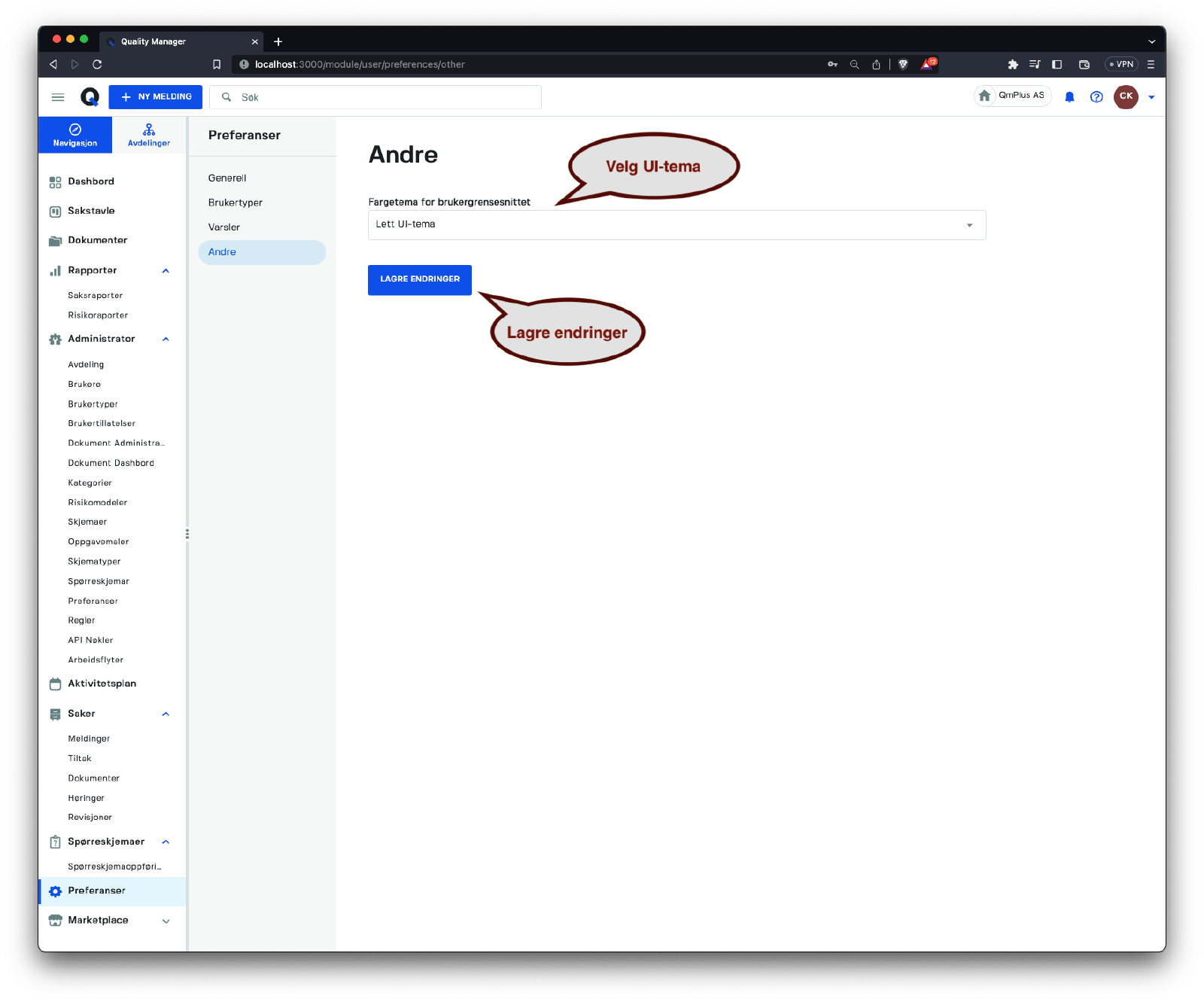 Ved å klikke på Preferences får du tilgang til brukerens spesifikke preferanser.