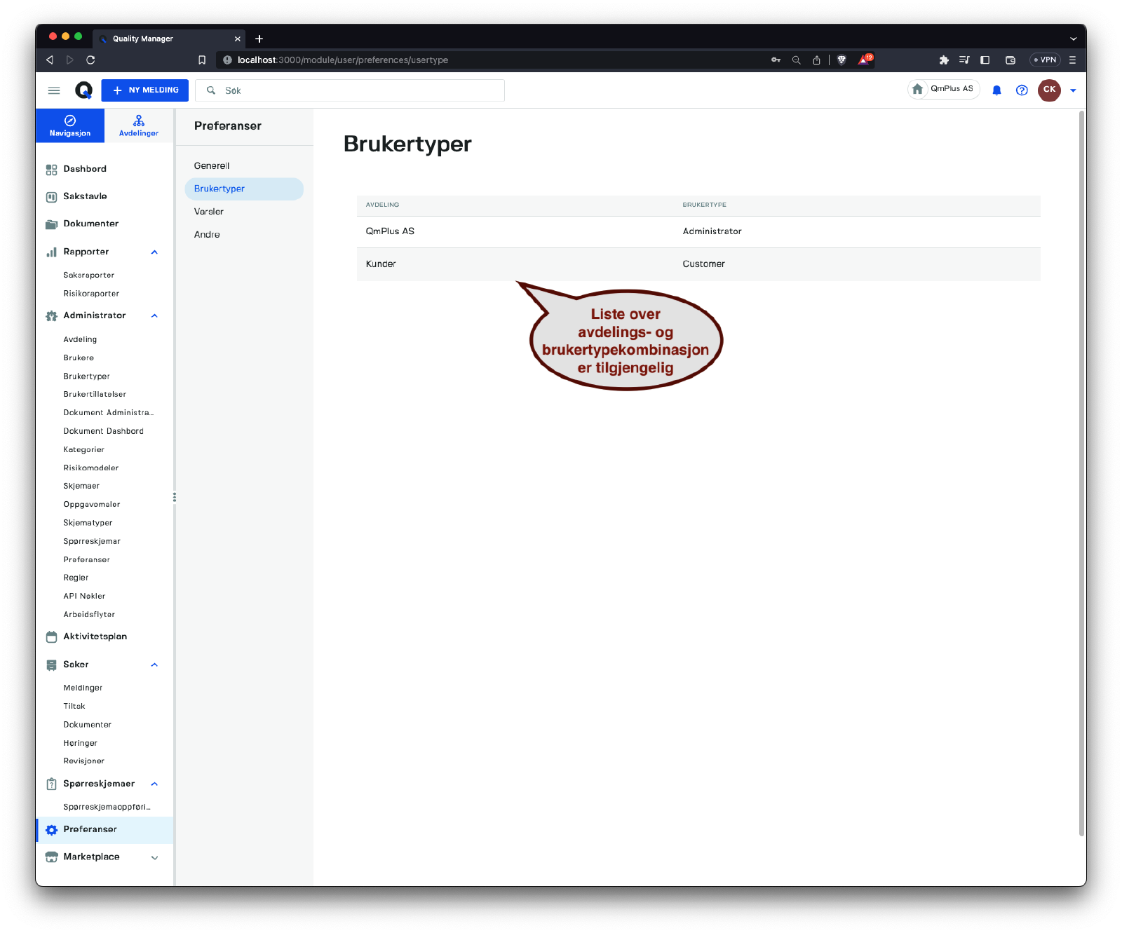 Brukertyper-alternativet viser den nåværende innloggede brukeren listen over avdelings- og brukertypekombinasjoner som er registrert på brukeren.