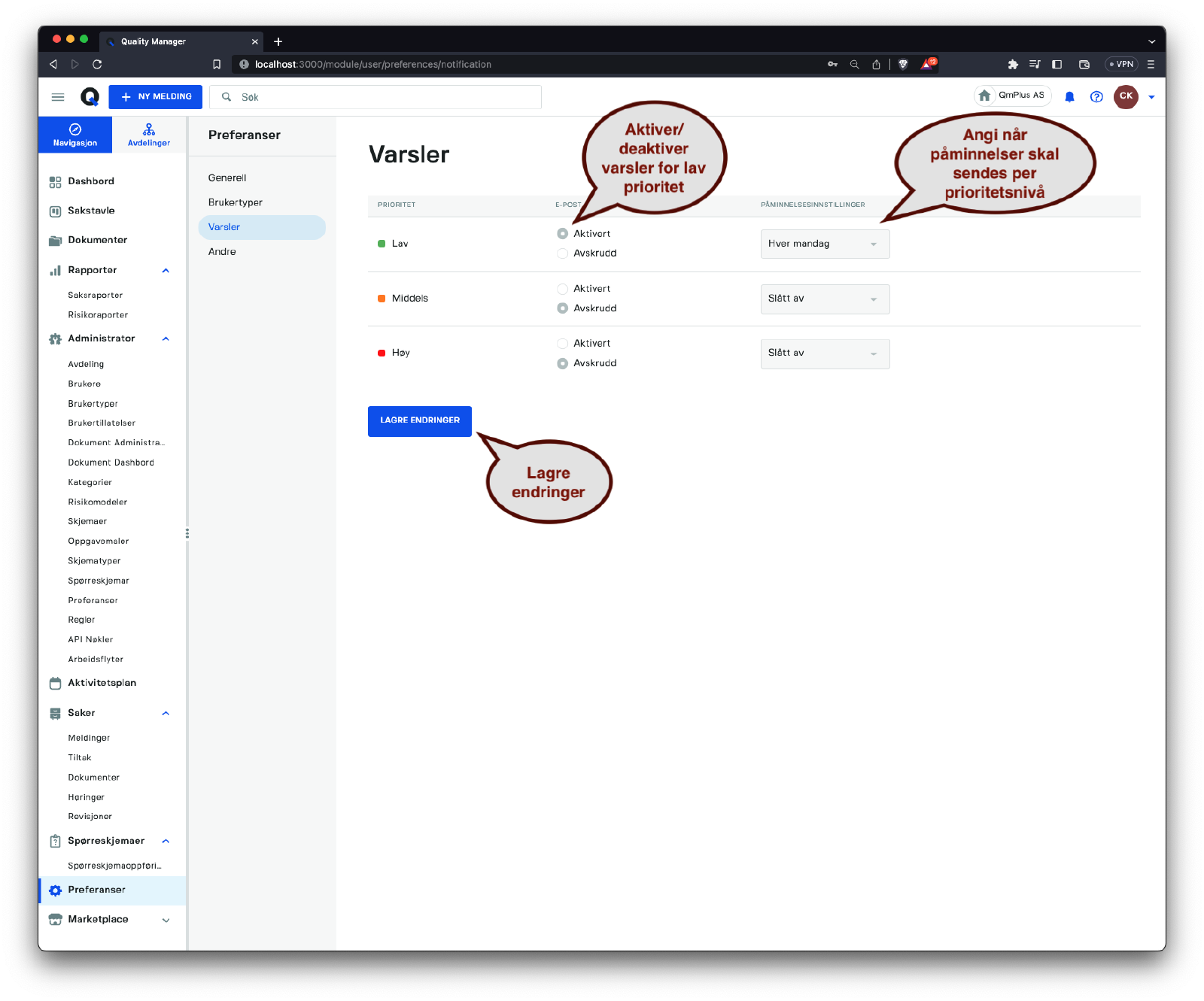 Varslingsinnstillingene er ordnet etter prioritet, og lar deg aktivere/deaktivere varsler for ethvert prioritetsnivå og angi leveringstidspunktet for påminnelser som sendes på e-post til den innloggede brukeren.