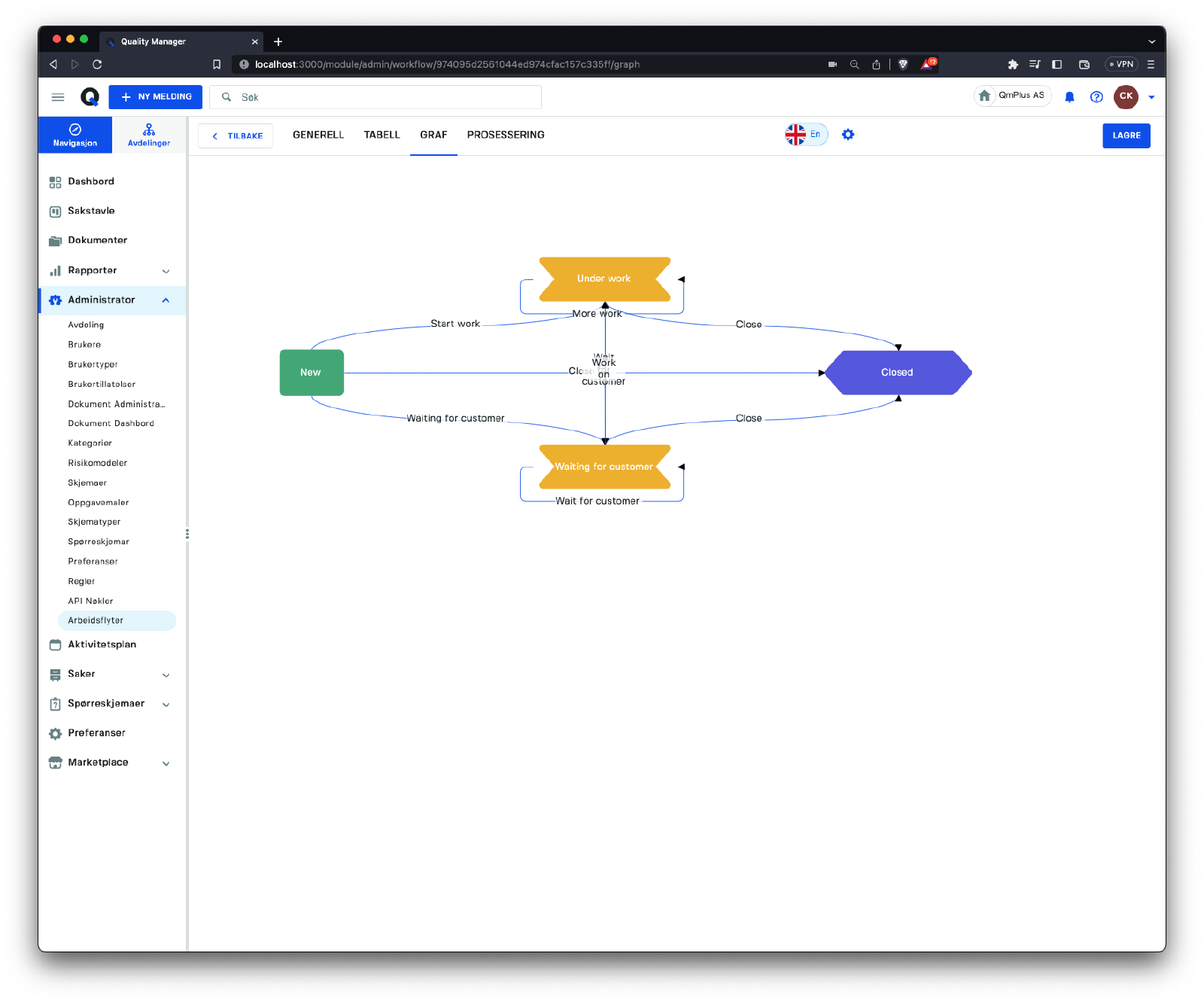 Graf-fanen viser en grafisk fremstilling av arbeidsflyten. Hver boks representerer en Sakstatus i arbeidsflyten, og hver linje mellom Sakstatusene representerer en overgang mellom to tilstander. Arbeidsflyten over er veldig enkel; nedenfor er et mer komplekst eksempel på en arbeidsflyt.