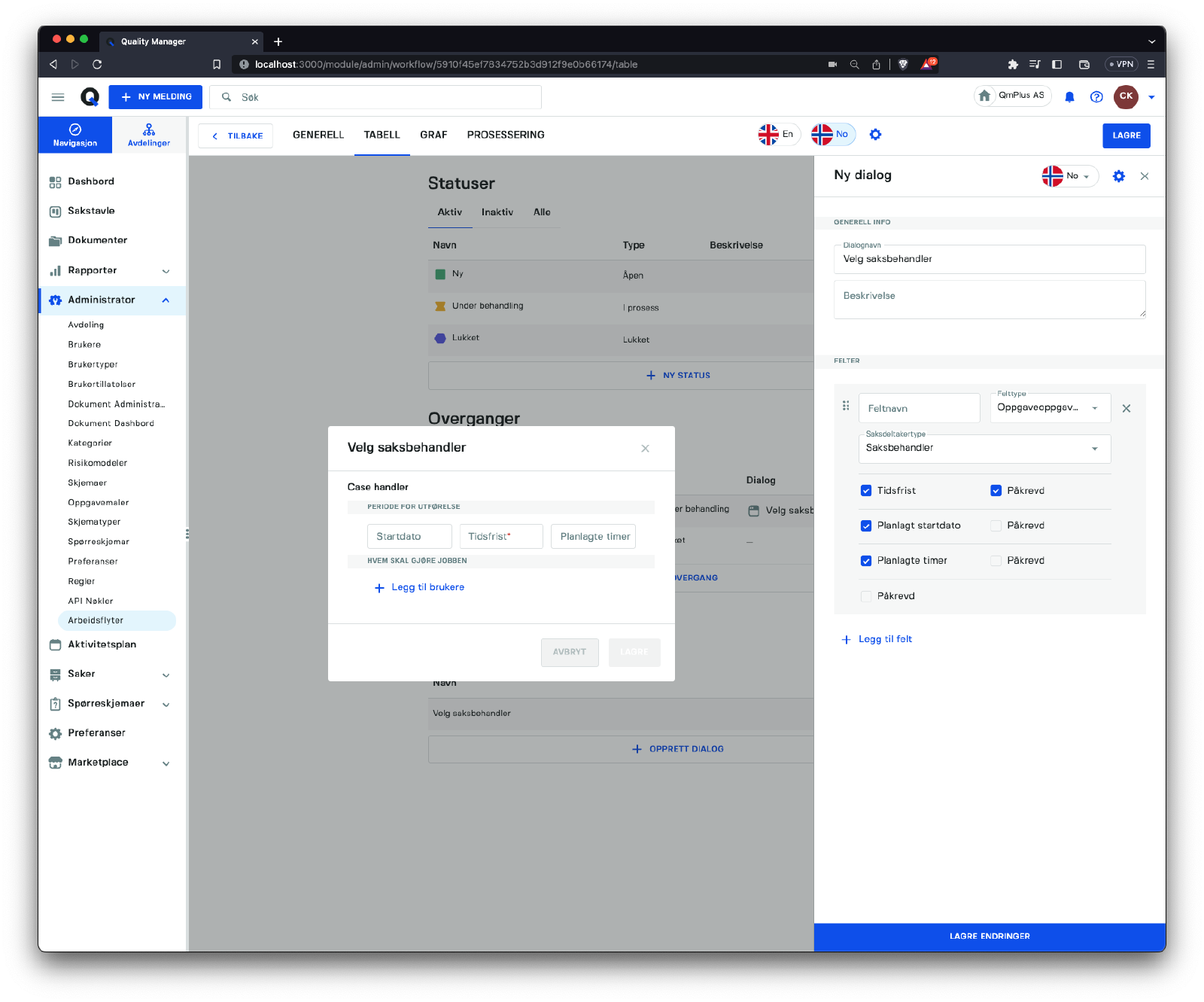 Oppgavetildelingsoppsett | Ja | Lar brukeren opprette oppgaver av en bestemt type når man går mellom statuser. Man kan også kontrollere om man ønsker å samle inn en Forfallsdato, Planlagte timer, og Planlagt startdato. |