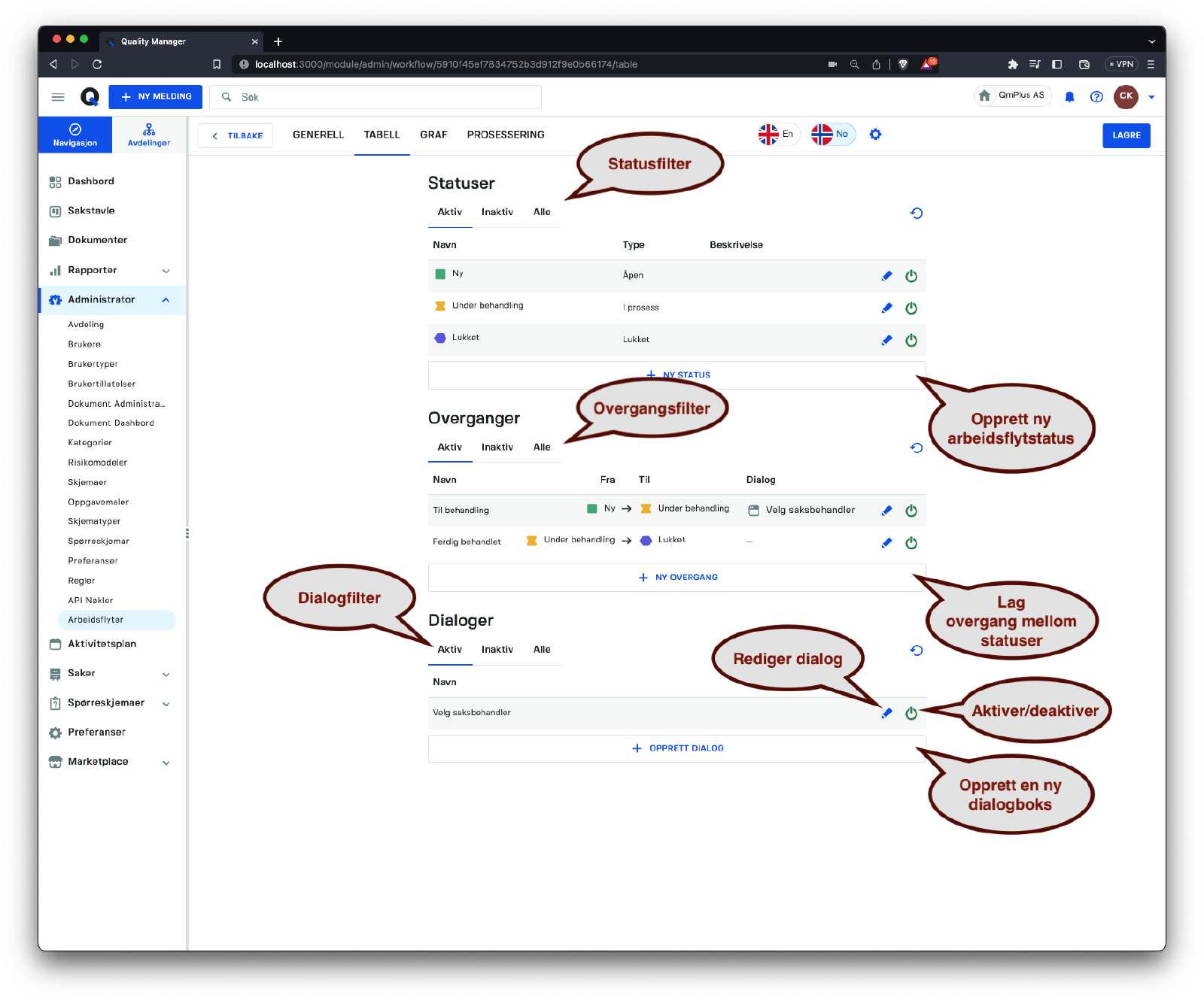 Tabell | Rediger statusene, overgangene og dialogene som utgjør arbeidsflyten. |