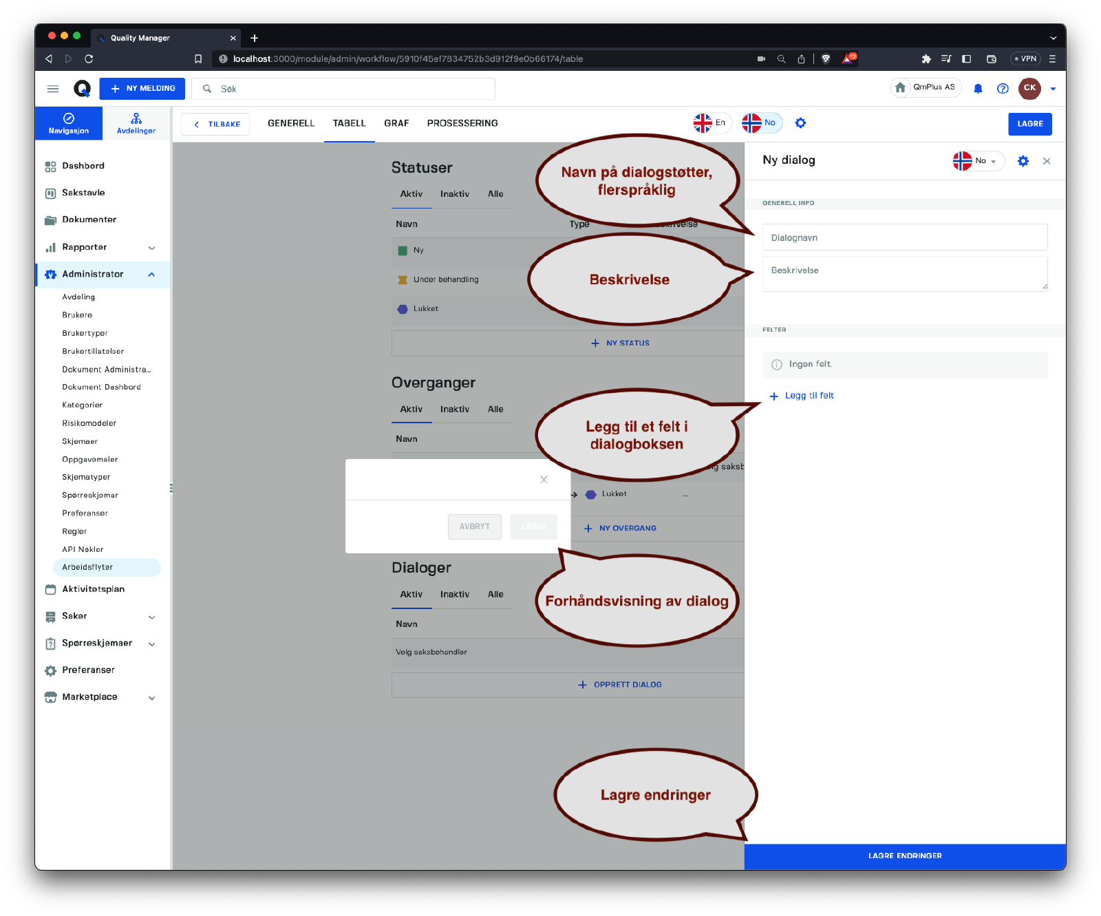 En dialog representerer et sett med felt som kan konfigureres av sluttbrukeren for å samle inn informasjon eller utløse handlinger ved en endring av status for en sak (en overgang). Dialoger er knyttet til overganger.